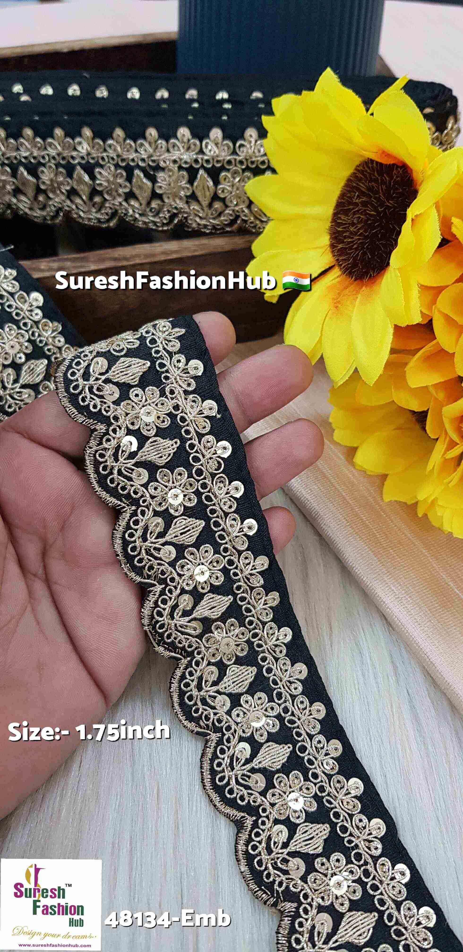 Introducing our *Scalloped Pearl Dori Floral Embroidery Lace* made on a delicate *Beige Net* base, a perfect blend of intricate craftsmanship and modern machine precision. This elegant lace is designed using high-quality *pearl dori, complemented by **5mm and 3mm sequins* that add a touch of shimmer, making it a versatile and luxurious trim for any occasion.