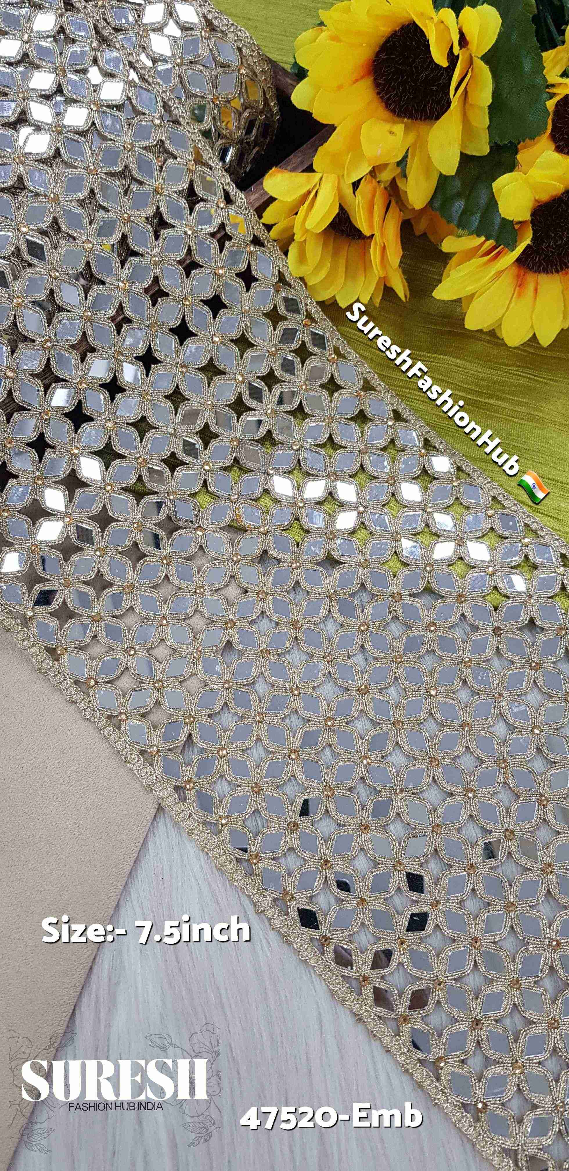 The *delicate yet bold cutwork pattern, enhanced by **shimmering mirrors, creates a **regal and timeless look*, ideal for bridal couture, festive ensembles, and designer projects.