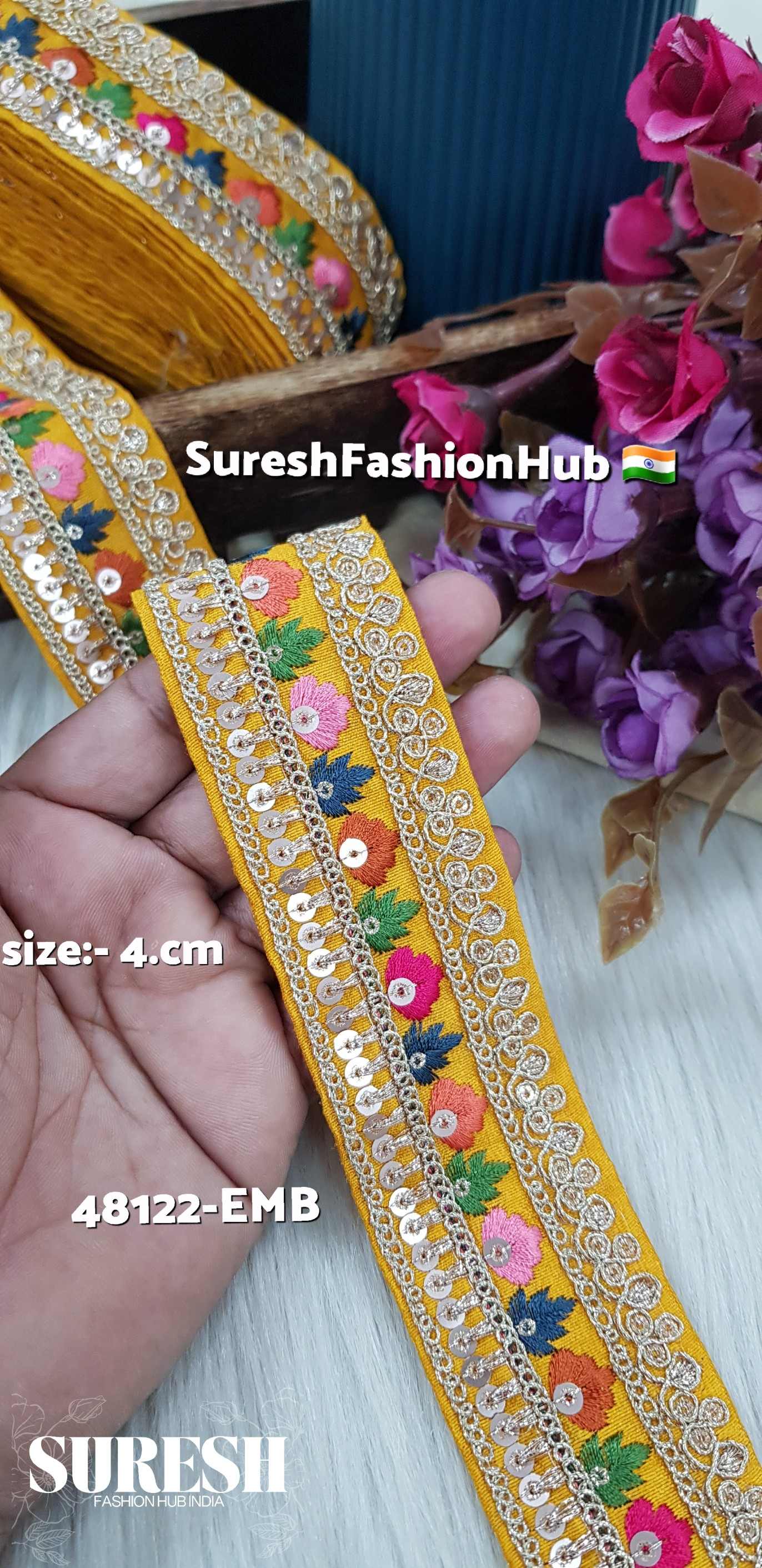 Inspired by the iconic aesthetics of *Sabyasachi, this 4 cm wide lace is a celebration of traditional craftsmanship. Made on premium fabric, it features a **rich floral pattern* designed using *multi-color threads, **sequins, **chappat, and **dori work*. The intricate embroidery and luxurious detailing make it a perfect choice for high-end fashion and bridal wear. Available in 8 royal shades to suit every design palette.