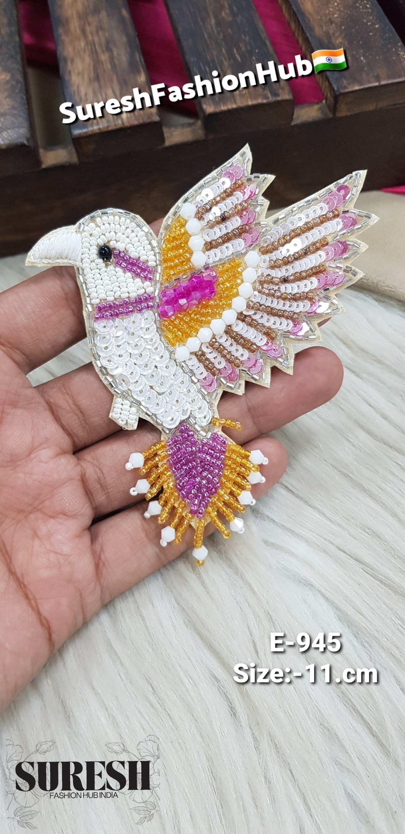 Right Facing White & Rani Multicolor Bird Patch – E-945