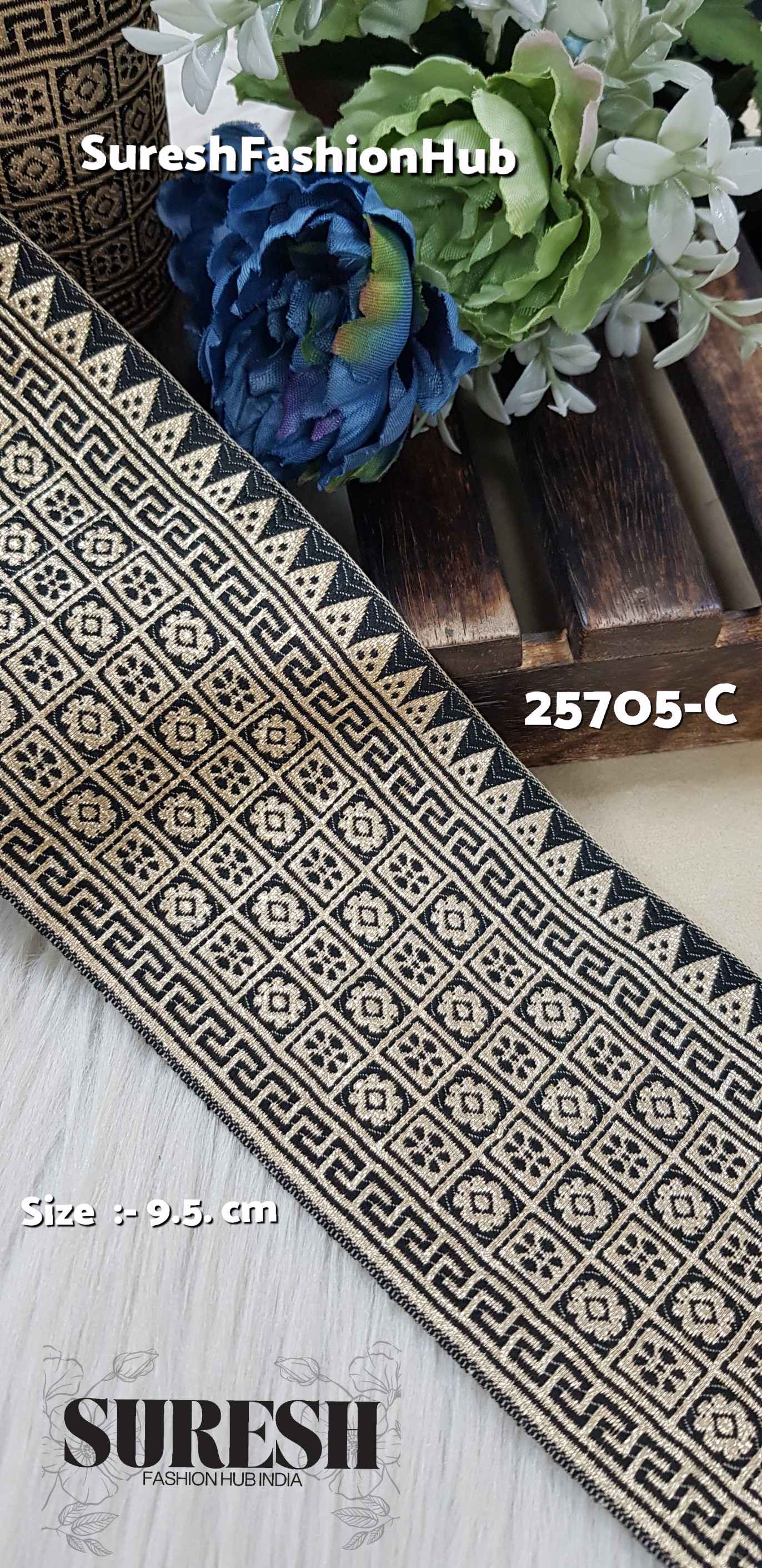 Introducing our *25705-C Banarasi Lace, a stunning 3.75 inch wide border crafted using advanced weaving machines right in our own factory. This is a *premium Banarasi-style lace featuring a *beautiful floral pattern* combined with a rich *gold zari look* — giving garments a touch of elegance and grace.