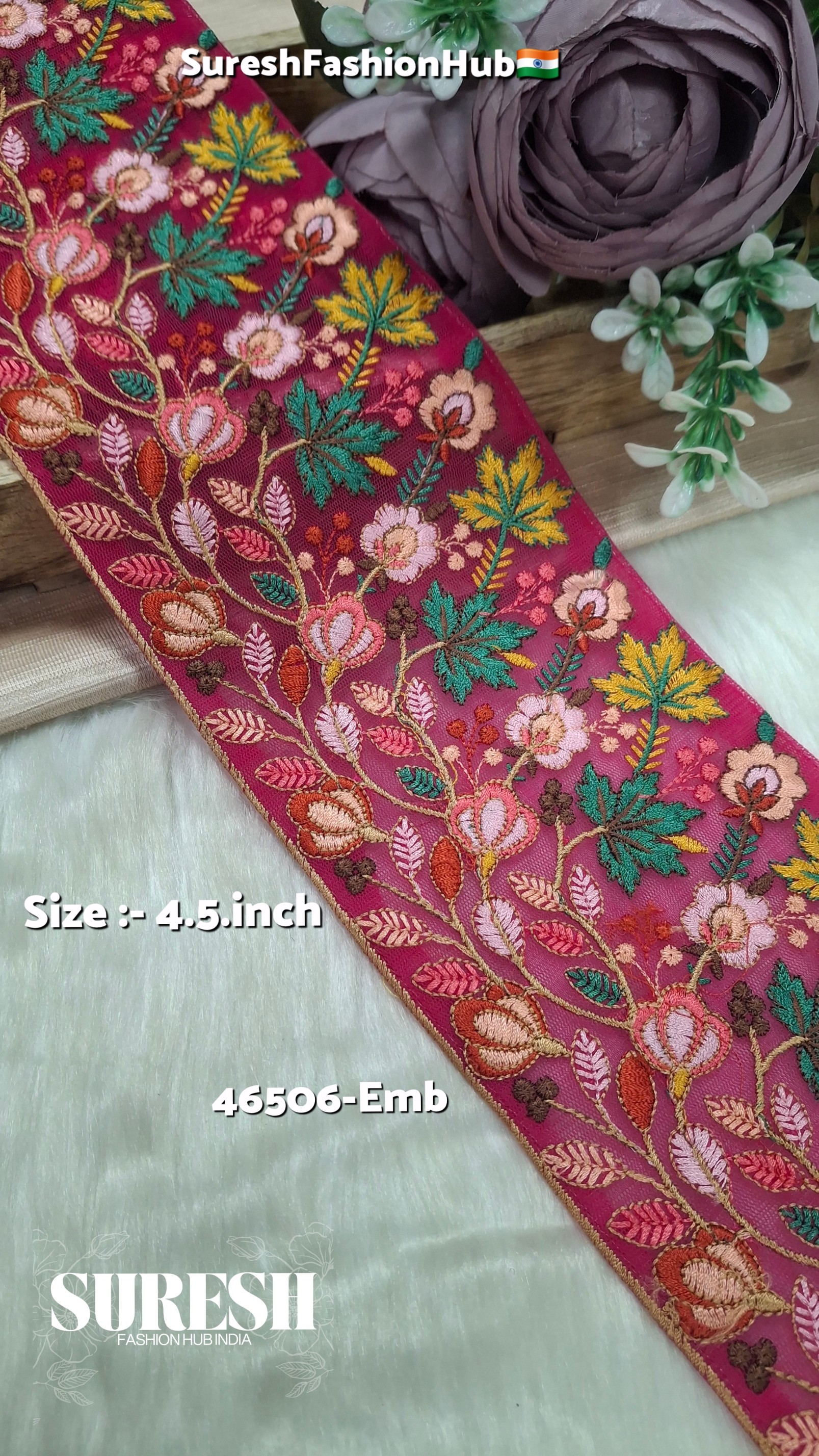 The *46506-Emb Royal Bloom Embroidery Lace* is a premium 4.5-inch net border crafted with rich *nine-needle multi-color thread embroidery. The lace is stitched beautifully on **both sides*, giving it a neat, fully finished designer look. With its elegant floral pattern and lovely thread combinations, this lace instantly enhances the beauty of sarees, dupattas, lehengas, and boutique outfits.