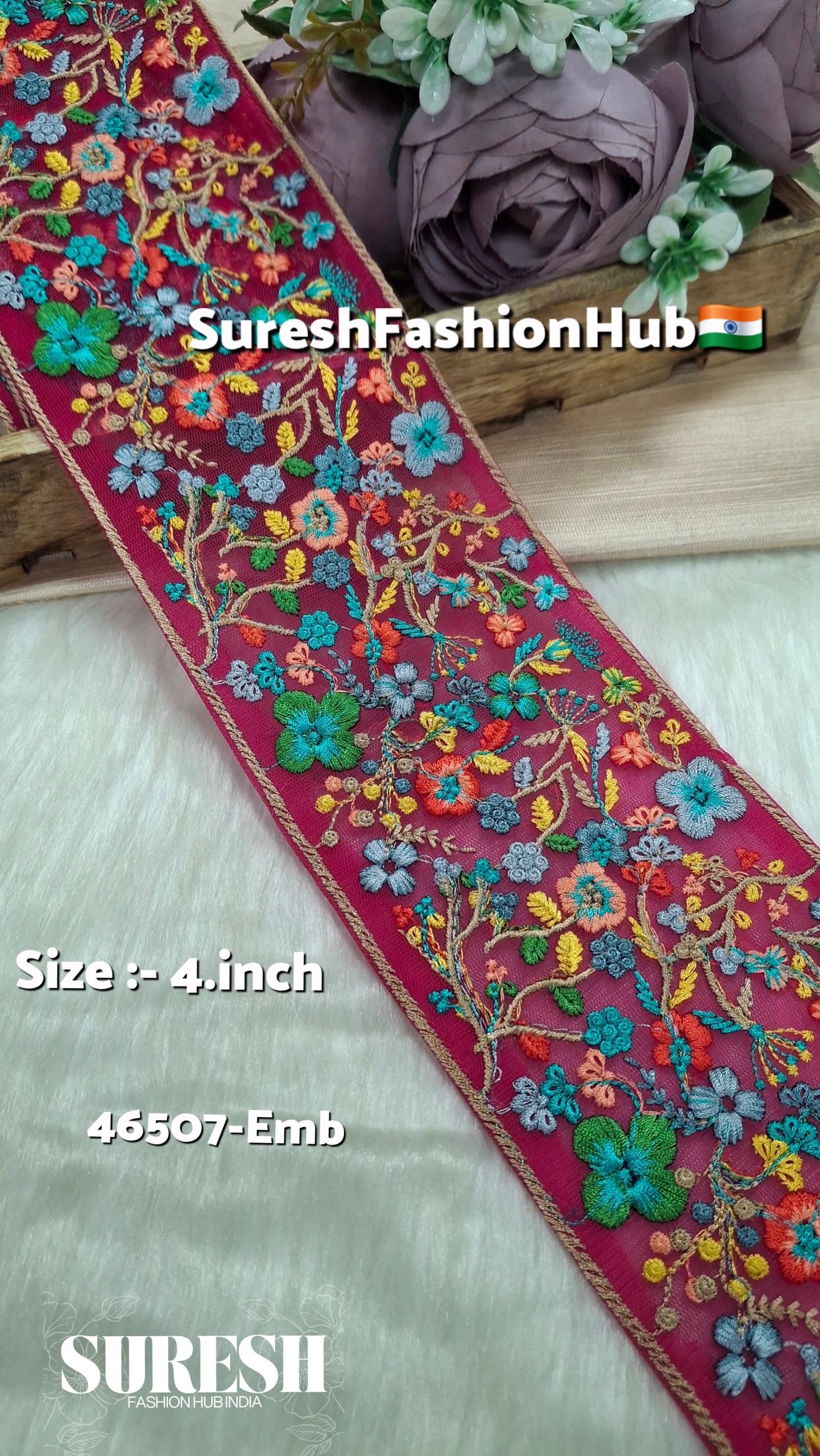 The *46507-Emb Blossom Weave Embroidery Lace* is a premium 4-inch net border featuring rich *nine-needle multi-color thread embroidery*. Both sides of the lace are carefully stitched, giving it a beautifully finished and designer appearance. With its elegant floral motif and vibrant thread combinations, this lace easily elevates sarees, dupattas, lehengas, and boutique fashion creations.