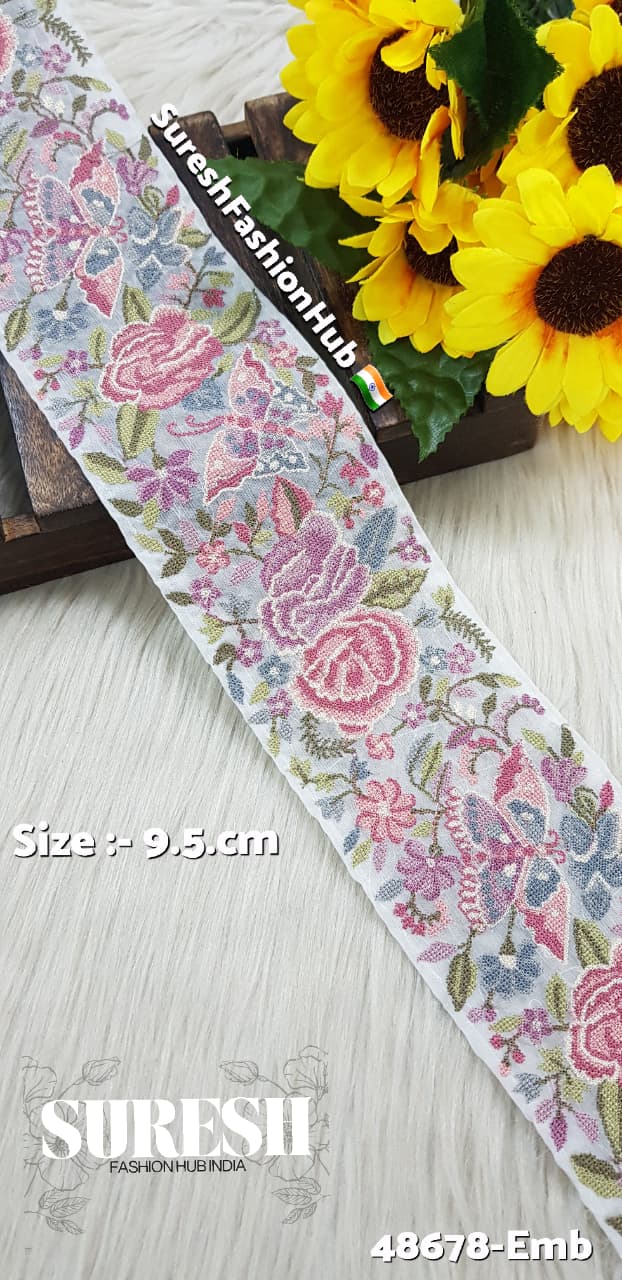 The *48678-Emb Cross Stitch Butterfly & Flower Border* is a beautifully crafted embroidery lace made on *organza fabric. This design features intricate **cross-stitch floral and butterfly patterns*, perfectly blended with vibrant thread combinations. Each color variant brings its own charm, giving a luxurious and royal appearance to your garments.