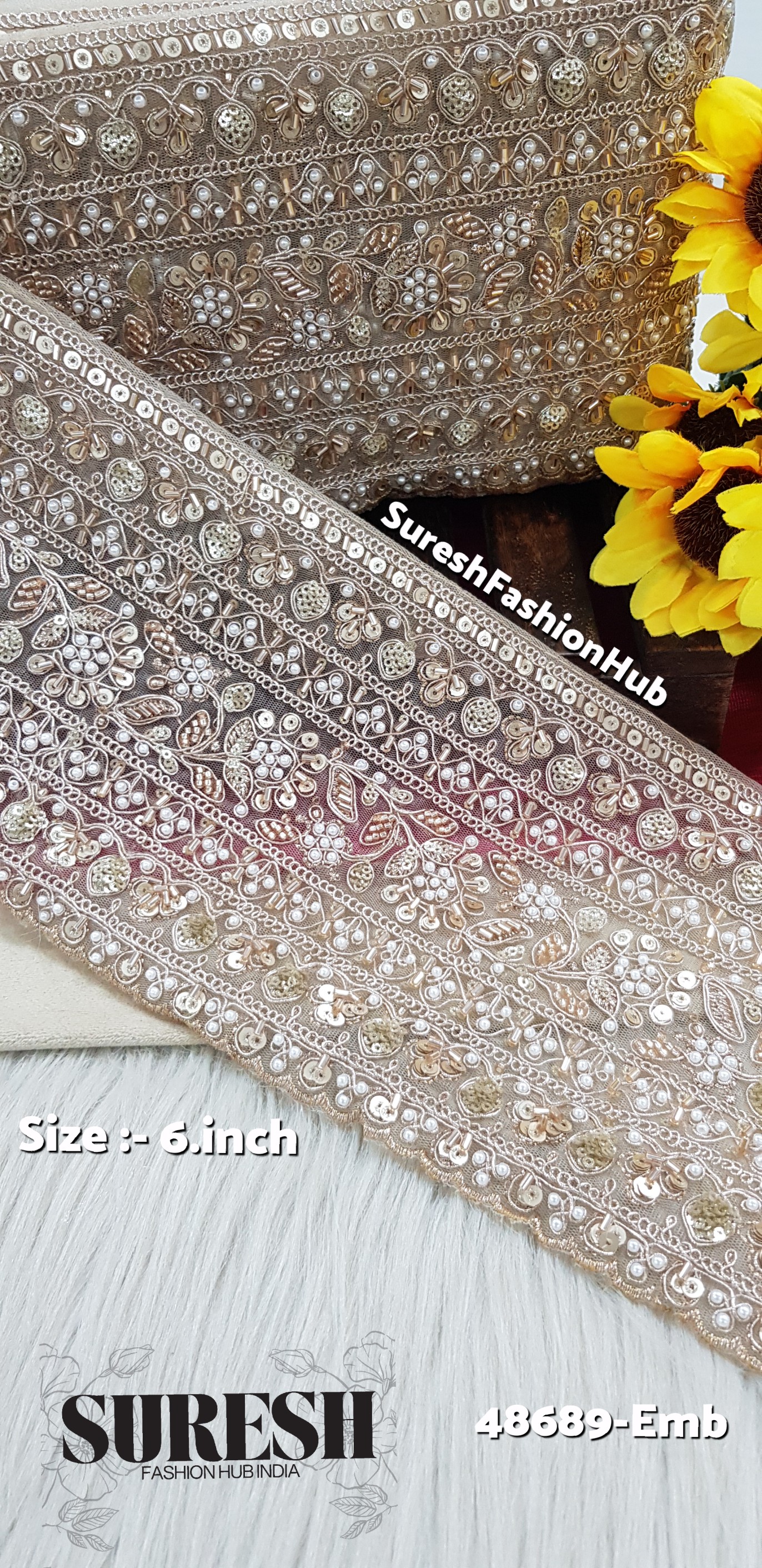 Introducing our 48689-Emb Machine Hand Embroidery Lace Border — an elegant 6-inch-wide creation that merges the grace of traditional embroidery with the precision of modern machinery. Crafted on *premium net fabric, this lace features a **beautiful one-side scallop floral design* made using dori, thread, sequins, pearls, zari, and cut-dana beads.