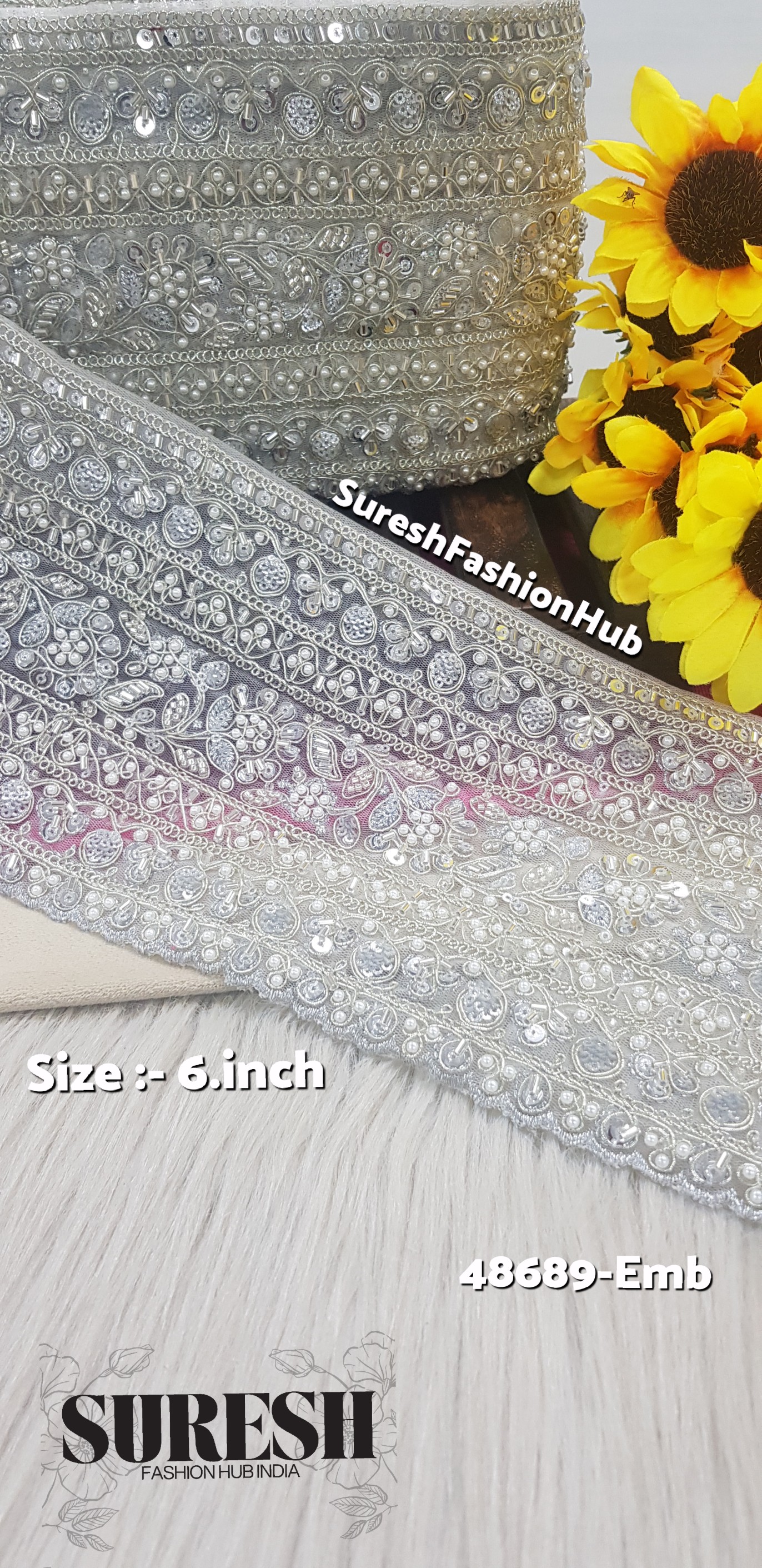Introducing our 48689-Emb Machine Hand Embroidery Lace Border — an elegant 6-inch-wide creation that merges the grace of traditional embroidery with the precision of modern machinery. Crafted on *premium net fabric, this lace features a **beautiful one-side scallop floral design* made using dori, thread, sequins, pearls, zari, and cut-dana beads.