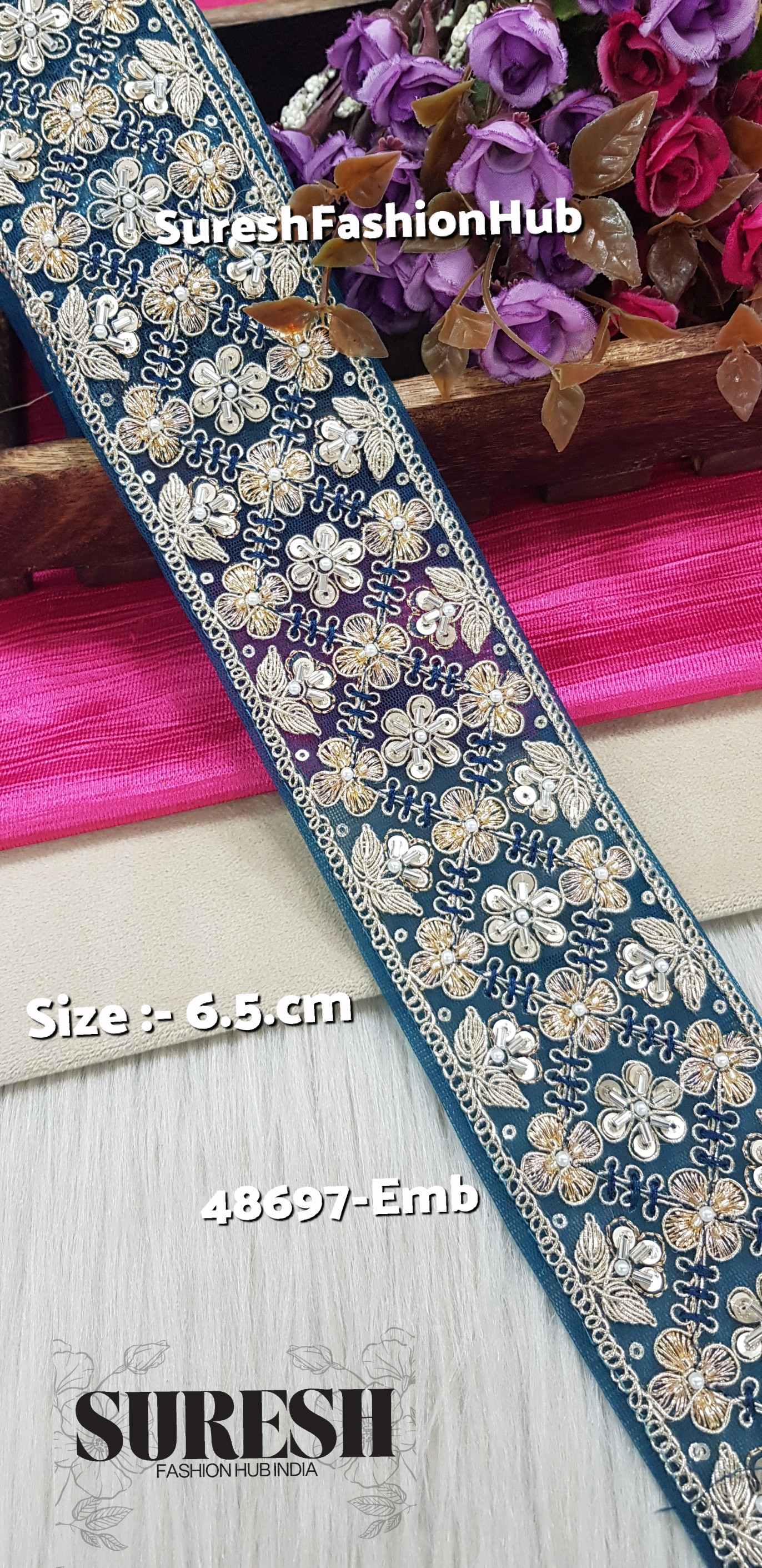 Introducing our *48697-Emb Machine Hand Embroidery Lace Border, a perfect blend of tradition and technology. Crafted on premium **net fabric, this elegant **2.5-inch border* showcases intricate *floral patterns* using *dori, thread, sequins, pearls, zari, and cut-dana beads*.
