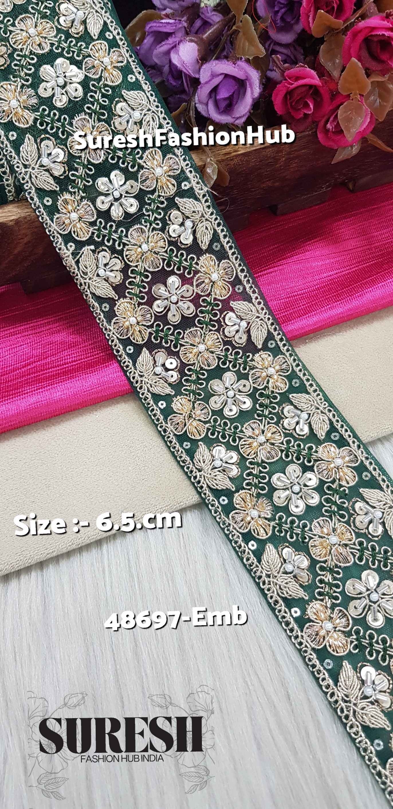 Introducing our *48697-Emb Machine Hand Embroidery Lace Border, a perfect blend of tradition and technology. Crafted on premium **net fabric, this elegant **2.5-inch border* showcases intricate *floral patterns* using *dori, thread, sequins, pearls, zari, and cut-dana beads*.