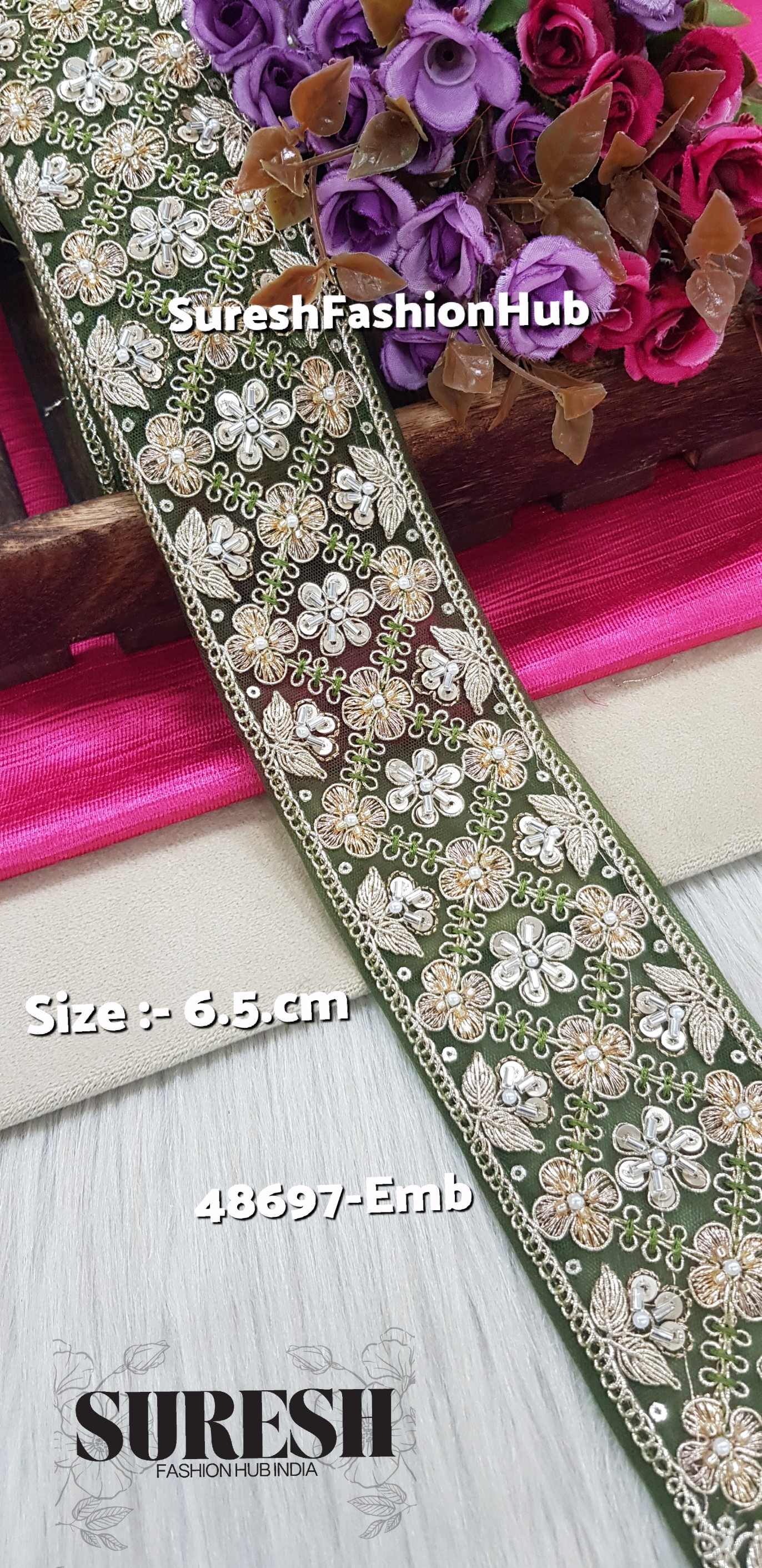 Introducing our *48697-Emb Machine Hand Embroidery Lace Border, a perfect blend of tradition and technology. Crafted on premium **net fabric, this elegant **2.5-inch border* showcases intricate *floral patterns* using *dori, thread, sequins, pearls, zari, and cut-dana beads*.