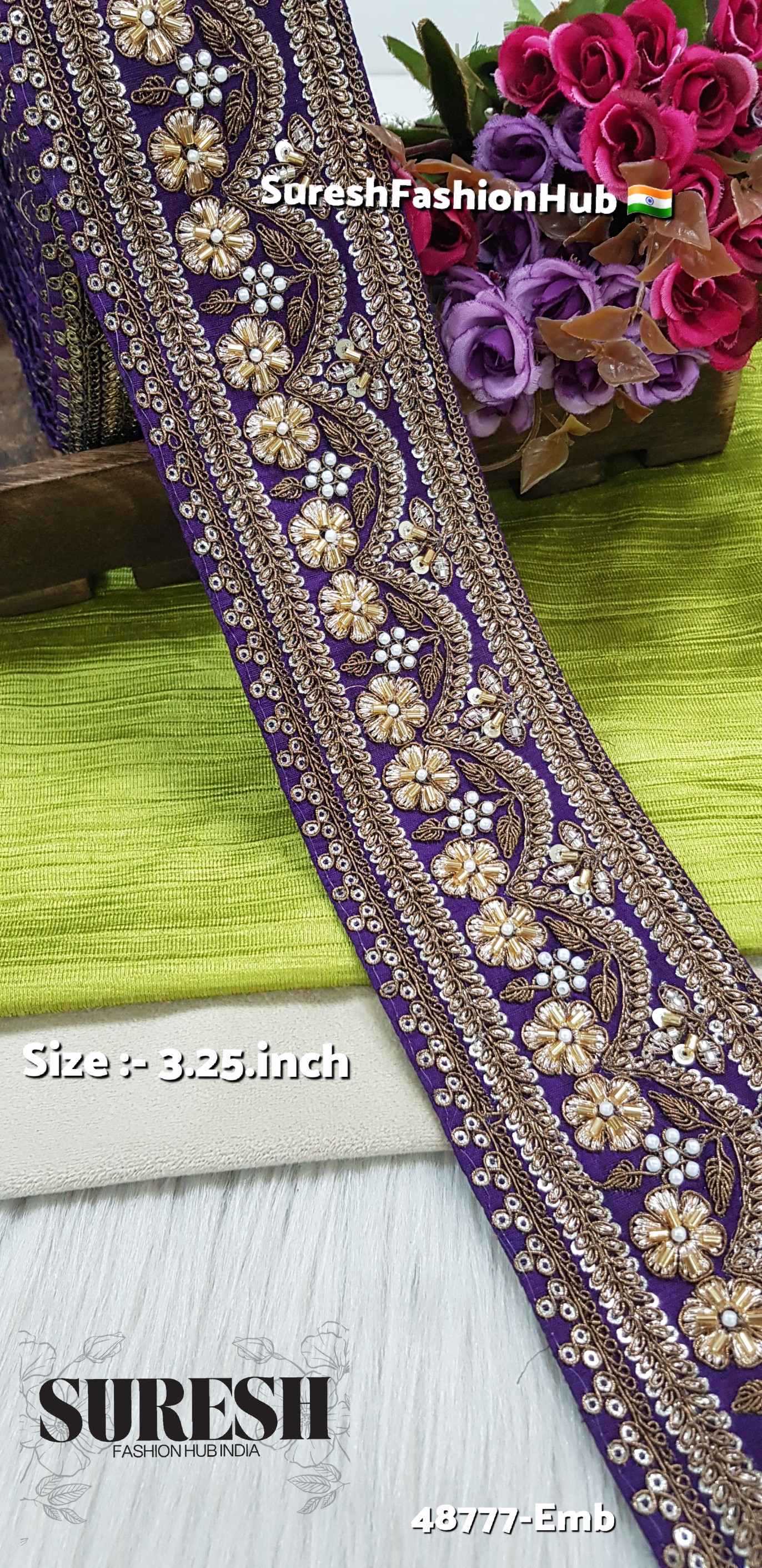 The *48777-Emb Royal ZariBloom Machine Embroidery Lace* is a premium floral border crafted using *matt dori, zari, sequence, pearls, cutdhana and chappat. Although it is machine-made, the detailing closely resembles **handmade zardosi work*, giving a luxury handcrafted appearance at a much better price.