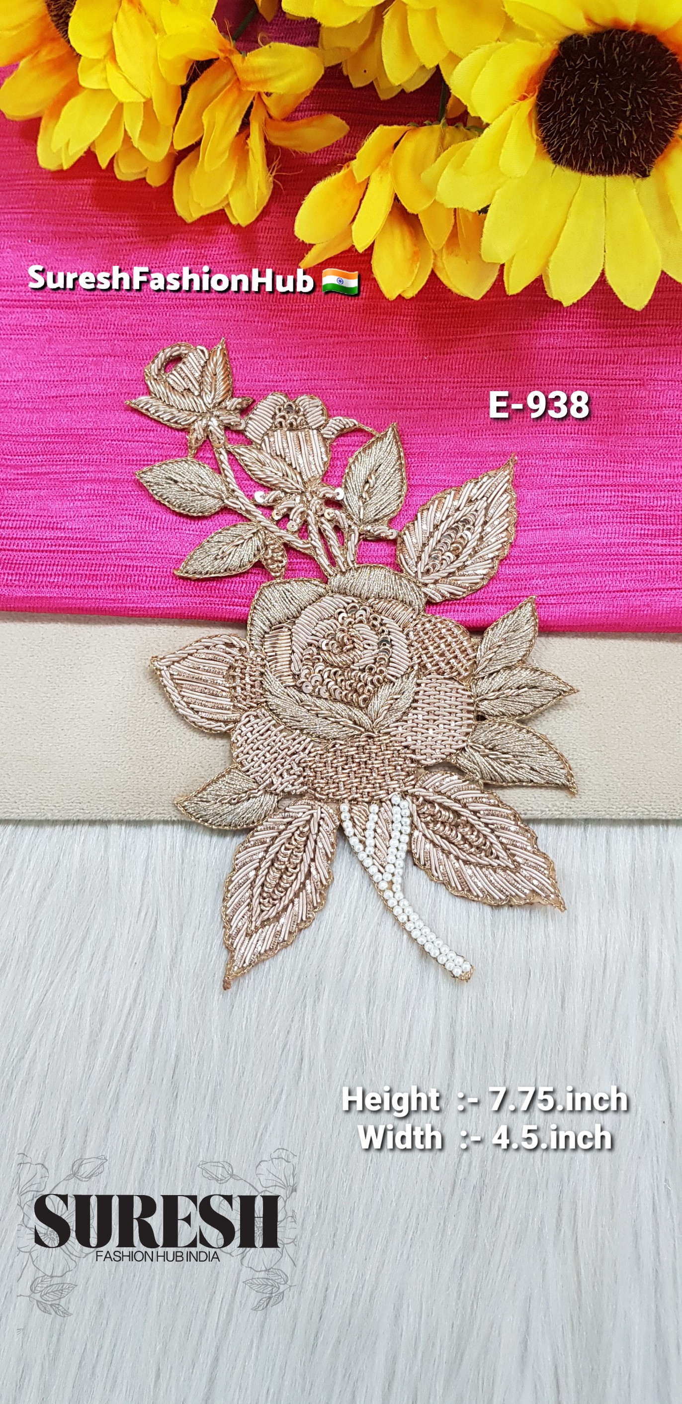 Presenting the Aesthetic Zardosi Rose Patch – E-938 by *Suresh Fashion Hub India*, the manufacturers of premium handmade laces, borders, patches & neck pieces.
