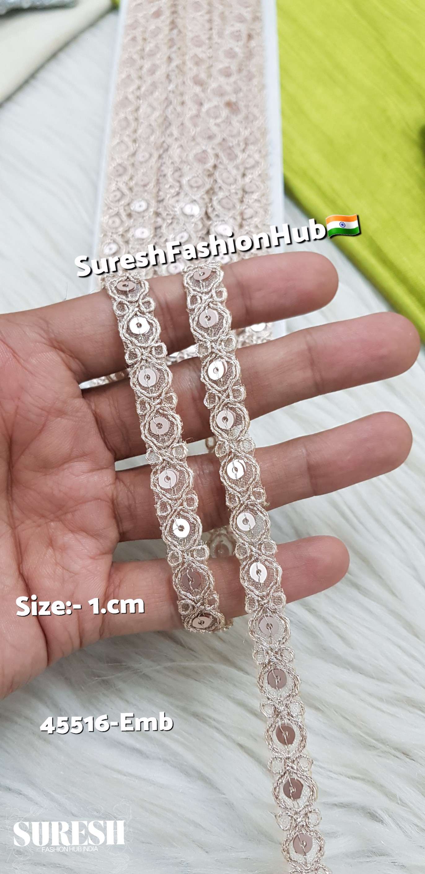 *Design No: 45516-Emb* is a subtle and stylish *border cutwork lace* created on sheer organza fabric. Designed with *beautiful dori and sequin work*, this lace offers just the right touch of shimmer and elegance. Its fine 1 cm width makes it ideal for delicate borders and small highlights on garments or accessories.