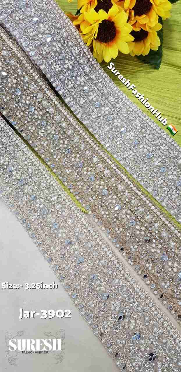 Jar-3902 is a lace that truly stands out for its *simplicity enhanced with luxury. The combination of a plain chord organza base with sparkling diamonds, soft pearls, and subtle mirrors creates a design that feels **beautiful, elegant, and effortlessly classy* — a piece one naturally falls in love with at first glance.