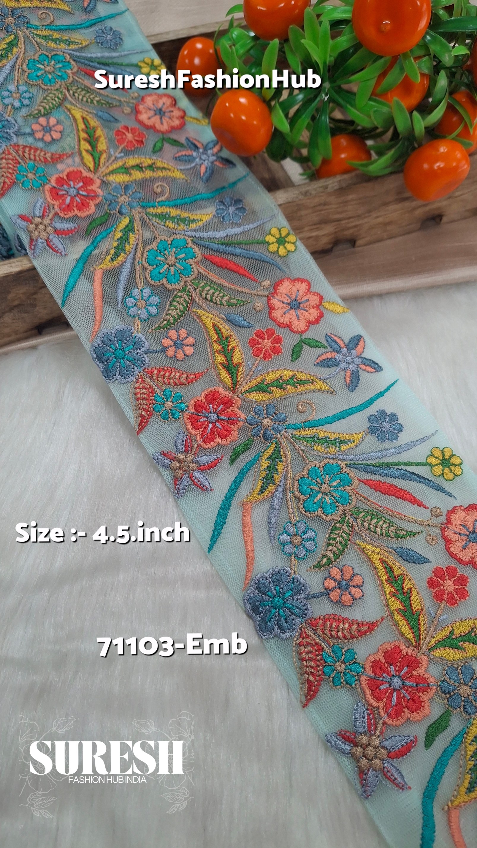 Net embroidery lace border, floral multi-thread lace, 9-needle embroidery lace, designer net border India, 4.5 inch net lace, boutique saree border lace, multi-color floral embroidery lace, premium lace trims India, ethnic wear lace border, Suresh Fashion Hub India lace.