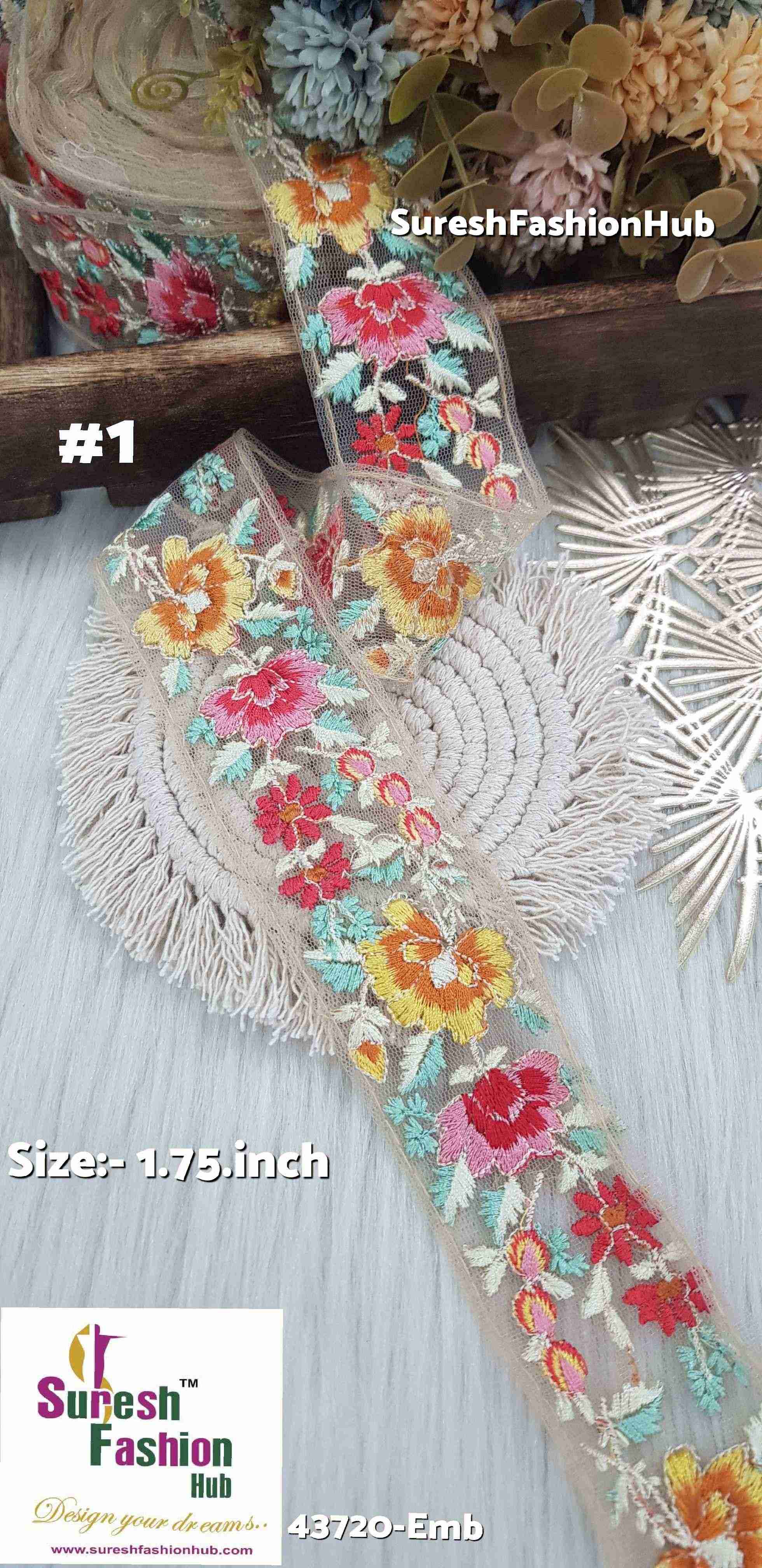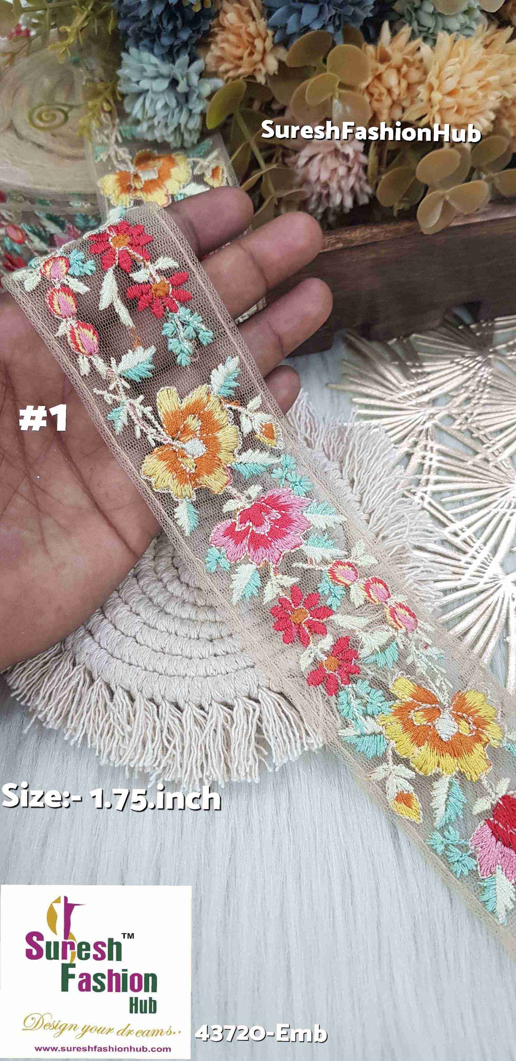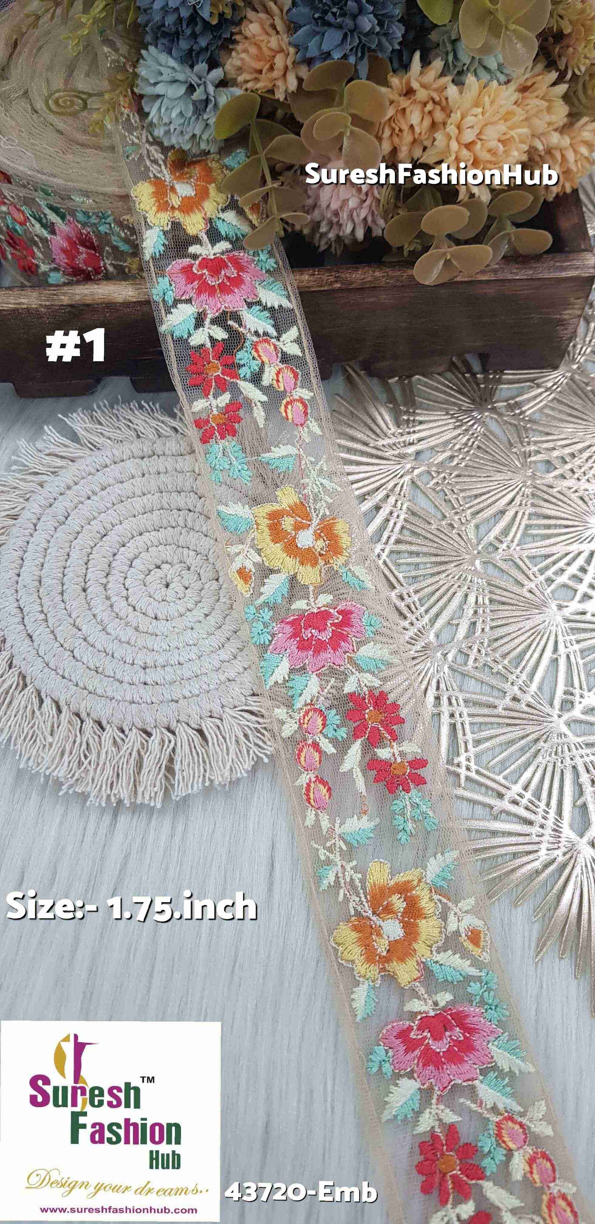 Dive into a world of vibrant hues with our Beige Embroidery Lace collection - 43720-Emb. Each lace, measuring 1.75 inches in size, features a stunning multicolor thread embroidery design on a delicate beige net fabric. With four captivating variations to choose from, including Beige Blossom, Beige Rainbow, Beige Carnival, and Beige Fiesta, these laces add a pop of color and personality to any project. Elevate your creations with the exquisite beauty of these intricately crafted laces, priced at Rs 810 for a generous 9-meter roll.