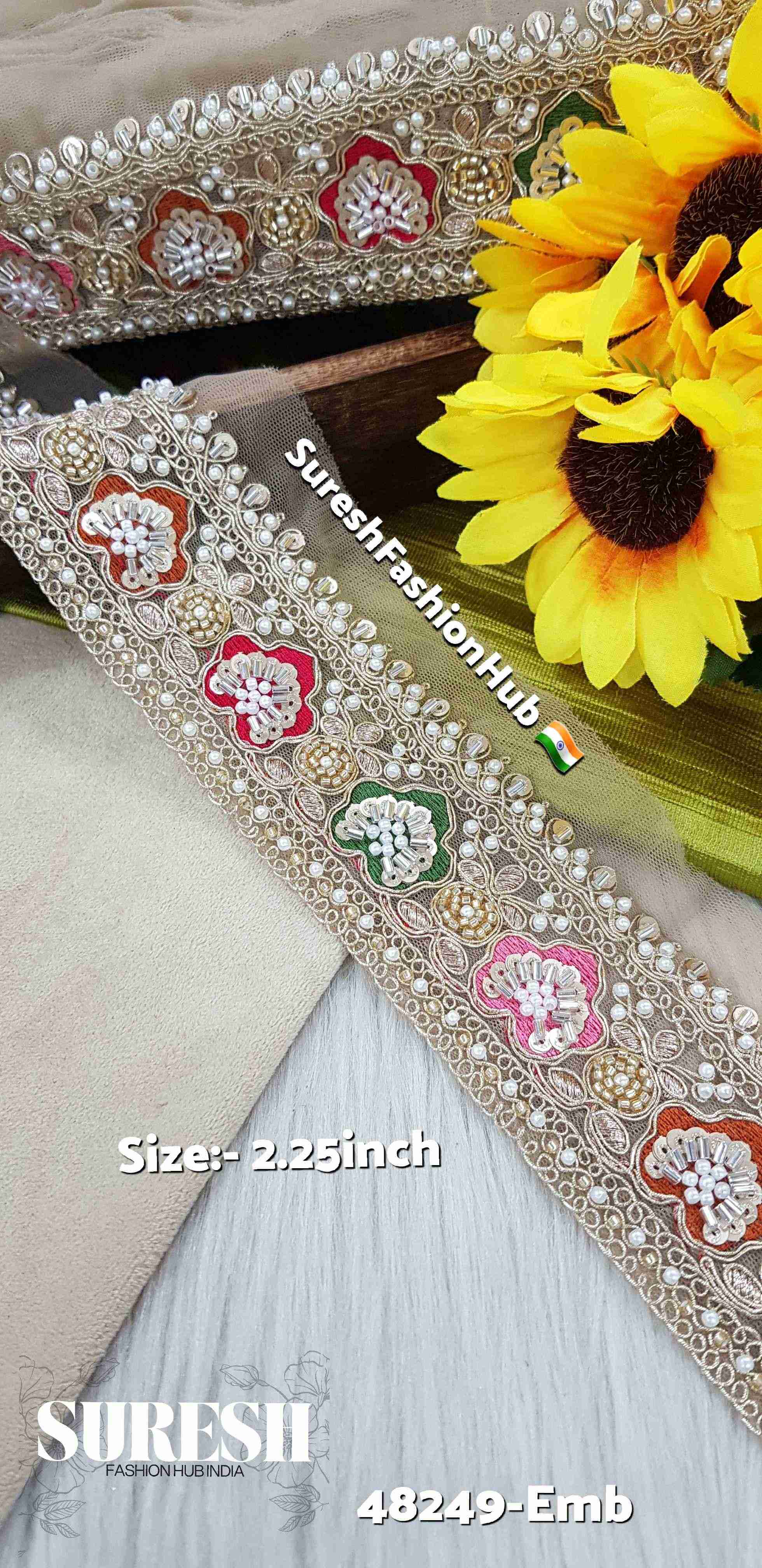 Experience the *grandeur and artistry of Sabyasachi-inspired design* with this *exquisite machine-handmade embroidery lace. Crafted on **premium beige net, this lace is adorned with **pearl dori, zari work, multi-colored threads, beads, sequins, pearls, and kaddhana, creating a **rich and vibrant look. The intricate floral patterns and fine detailing make this lace a **must-have for designers, boutique owners, and anyone who appreciates high-end fashion embellishments*.