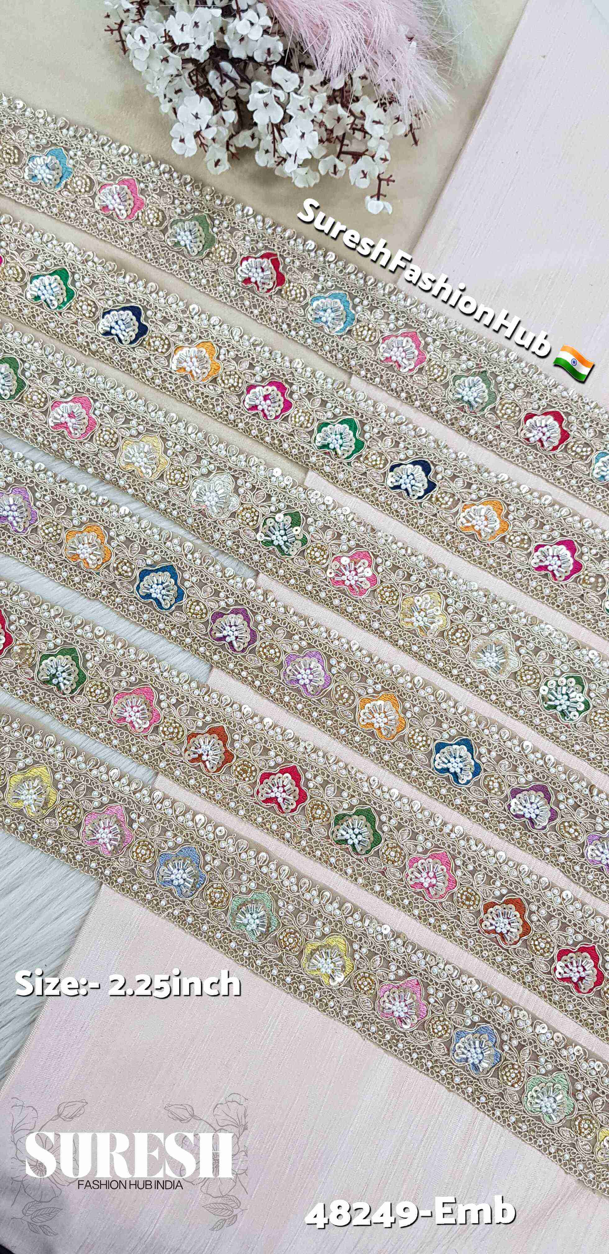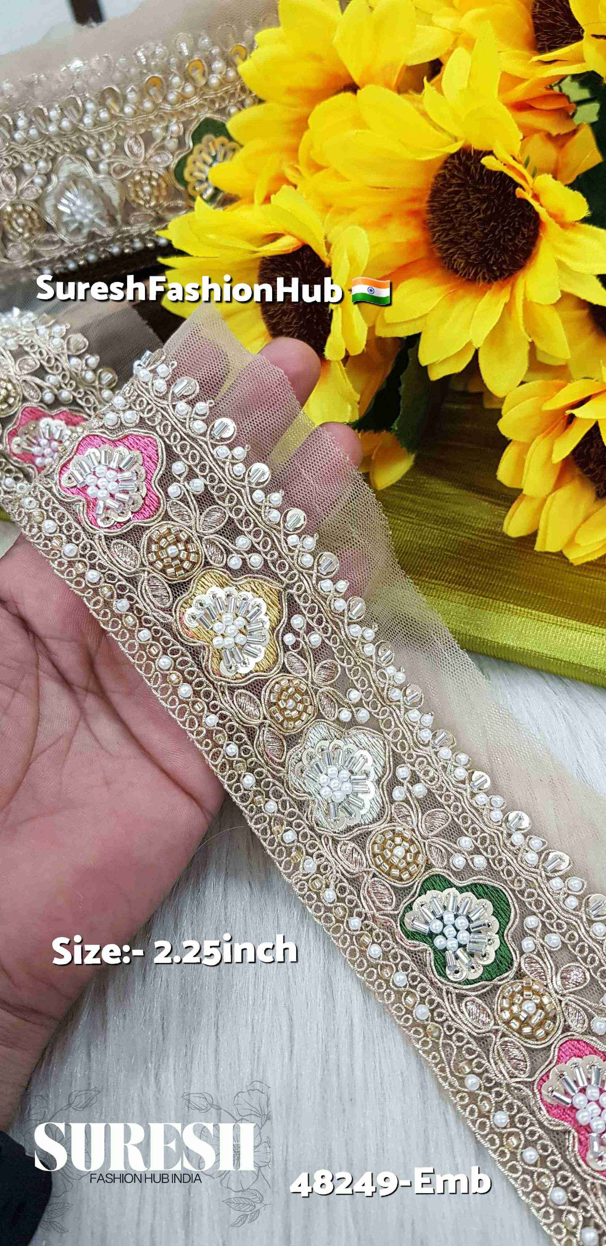 Experience the *grandeur and artistry of Sabyasachi-inspired design* with this *exquisite machine-handmade embroidery lace. Crafted on **premium beige net, this lace is adorned with **pearl dori, zari work, multi-colored threads, beads, sequins, pearls, and kaddhana, creating a **rich and vibrant look. The intricate floral patterns and fine detailing make this lace a **must-have for designers, boutique owners, and anyone who appreciates high-end fashion embellishments*.