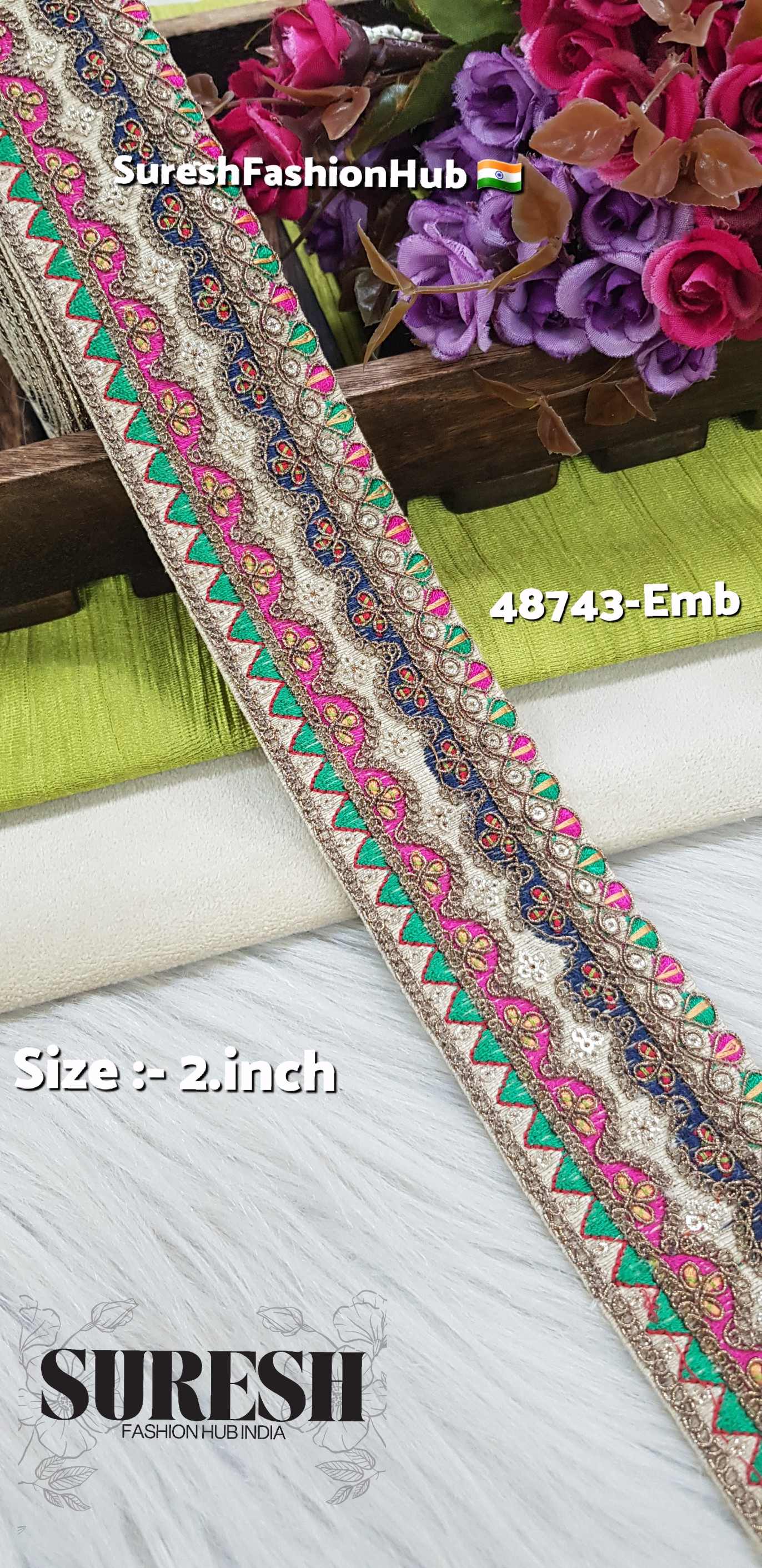 2 inch embroidery lace, Sabyasachi inspired lace border, designer ethnic wear lace, boutique lace border wholesale, multi-color thread lace India, matt dori lace, glitter sequence lace, chappat work lace, 48743-Emb lace, premium saree lace border, SF India laces, couture lace border.