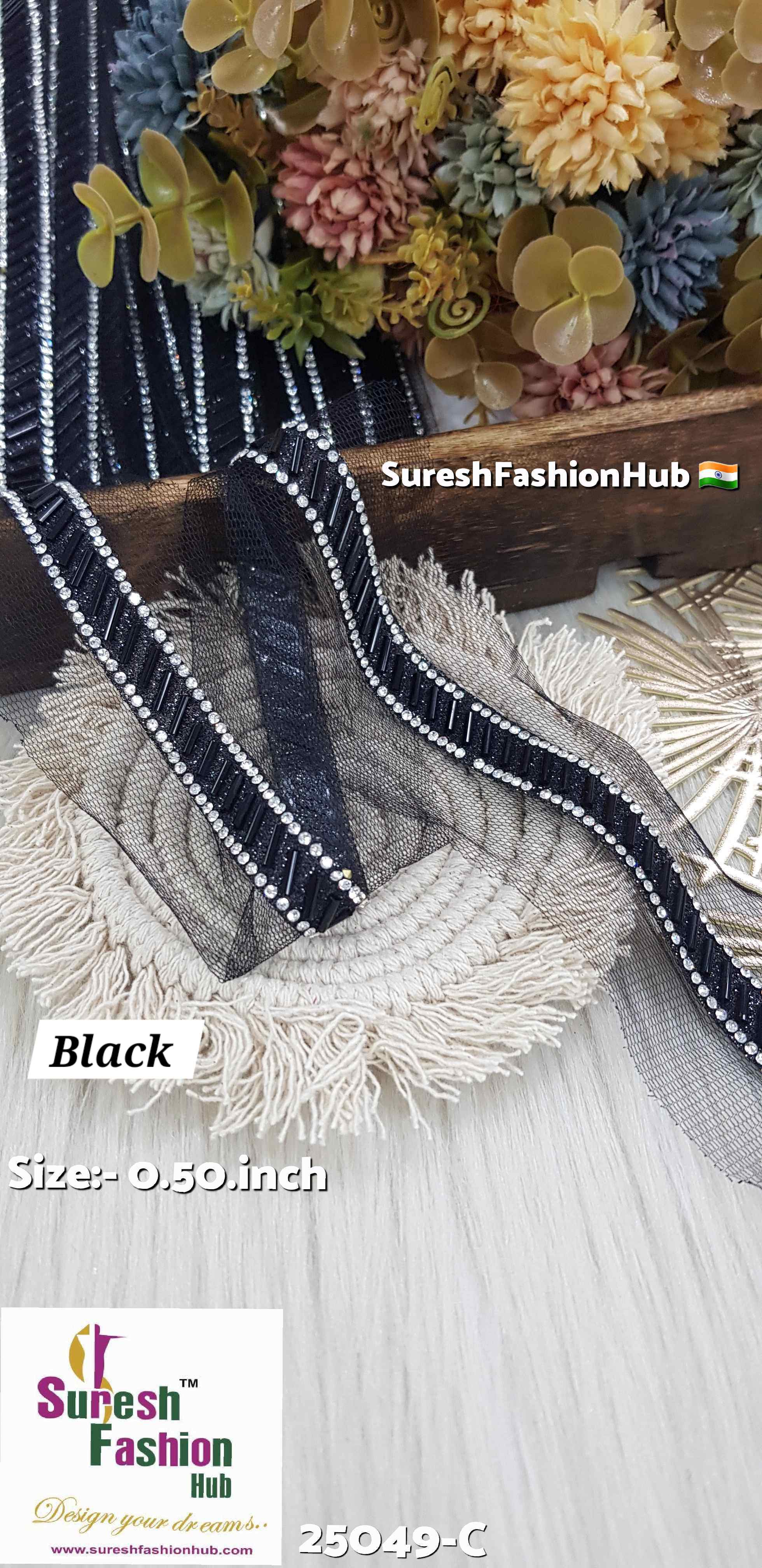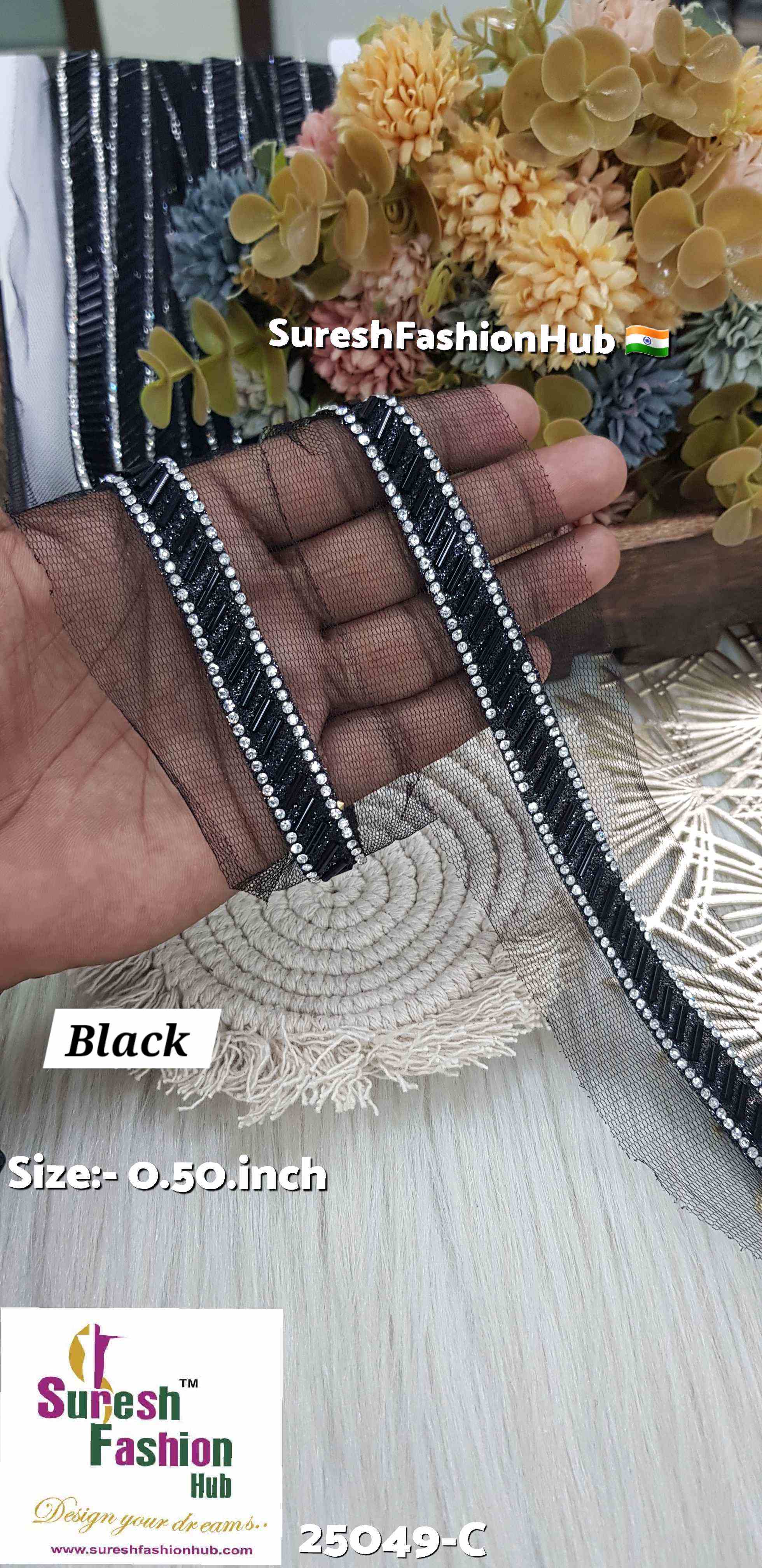 Introducing Black Elegance Borders, Design No: 25049-C. These sophisticated borders, priced at Rs 725 for 9 meters, showcase Kaddhana with Diamonds from Jharkand on a striking black backdrop. Ideal for enhancing the beauty of any attire with a hint of mystery and charm.