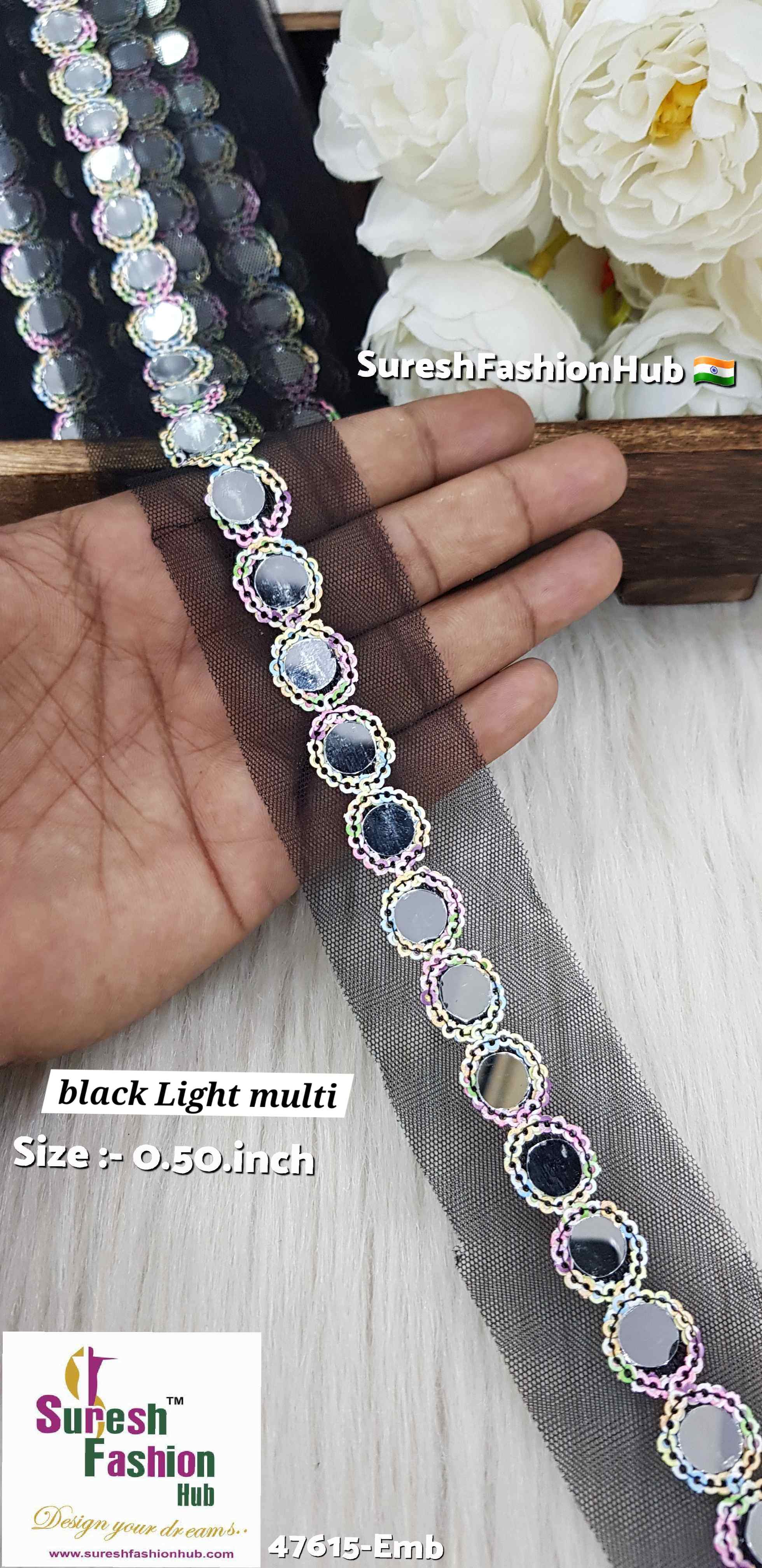 Introducing our *47615-Emb Sequin Mirror Lace*, a stunning embroidery design crafted with exquisite sequins on a delicate net base. This lace is further enhanced by the addition of round mirrors, creating a beautiful, reflective border that adds a touch of elegance to any garment or accessory.