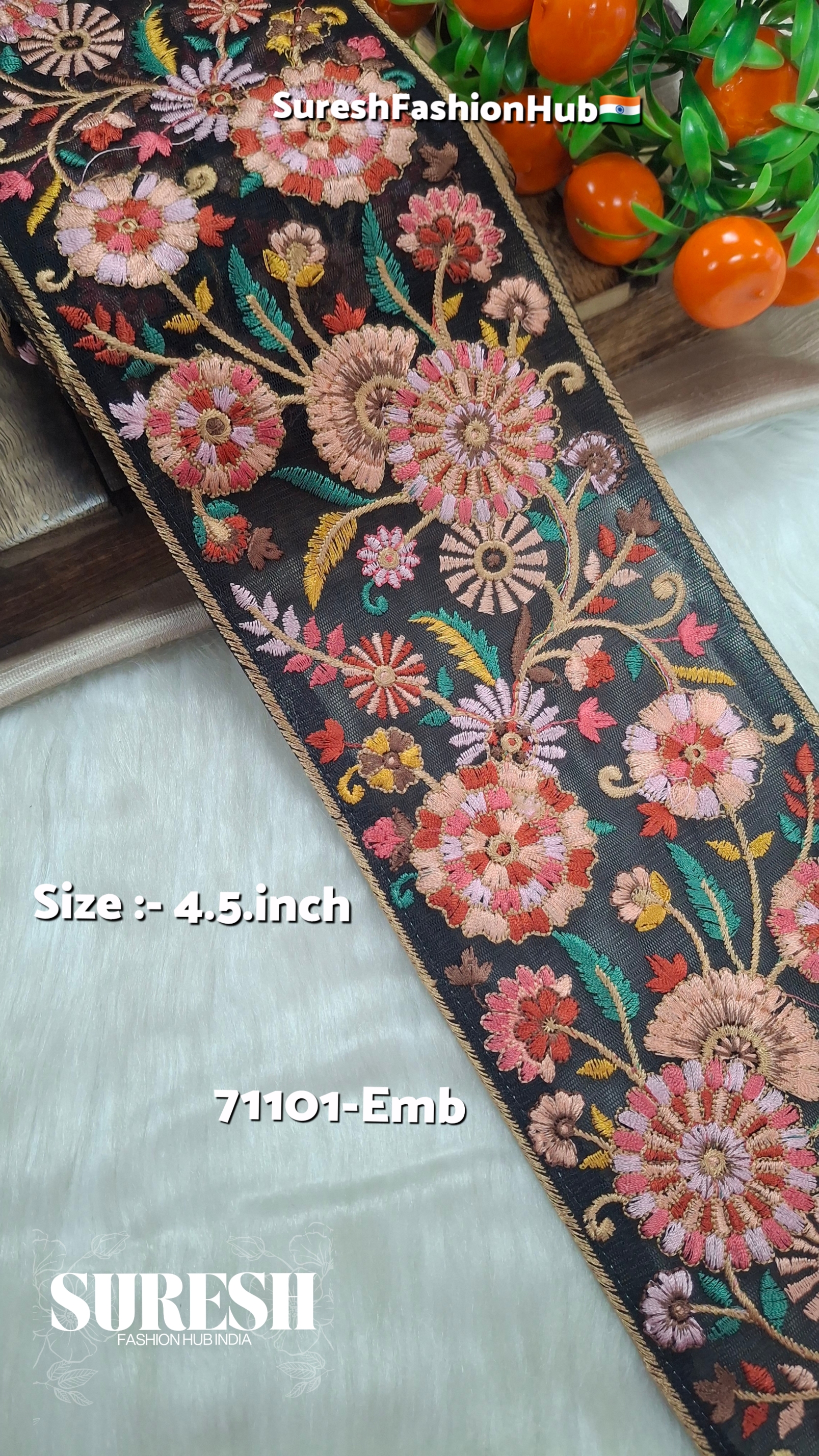 net embroidery lace border, floral embroidery lace, 4.5 inch embroidery lace, nine-needle thread work lace, designer net border, multi-color thread lace, boutique lace supplier India, Suresh Fashion Hub India lace, premium embroidery trims, fashion garment lace borders.