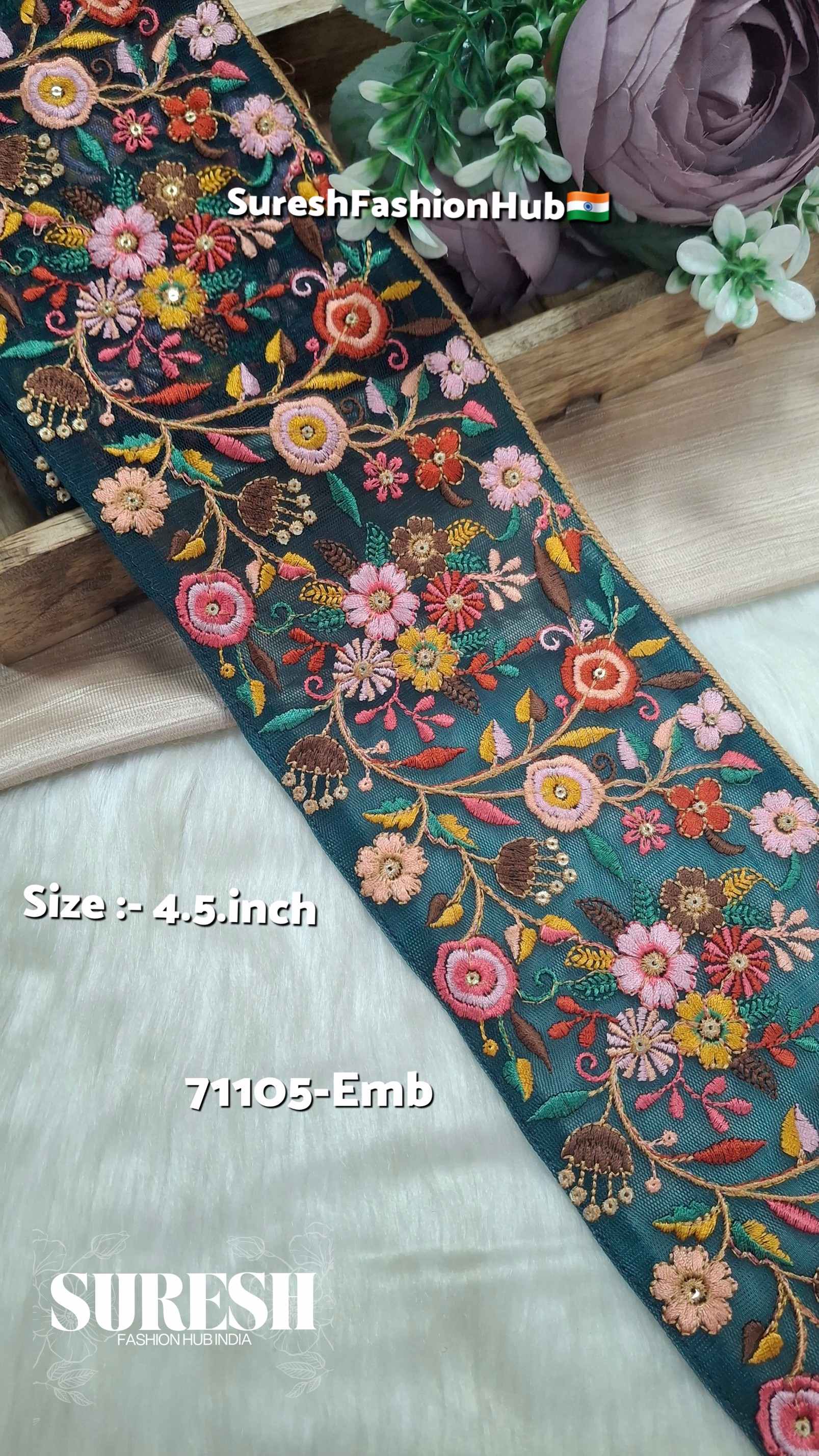 Presenting the *71105-Emb Net Floral Multi-Thread Border, crafted on premium net fabric with **nine-needle multi-color embroidery*. The floral pattern is vibrant, beautifully detailed, and stitched on both sides for a neat and premium finish.