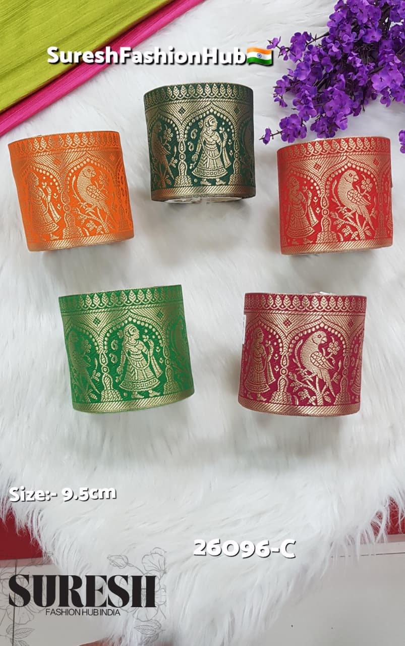Enhanced with a *golden Banarasi touch, the design appears rich and festive, making it perfect for premium garments. With its **9.5 cm broad width*, it creates a bold and eye-catching border that stands out beautifully.