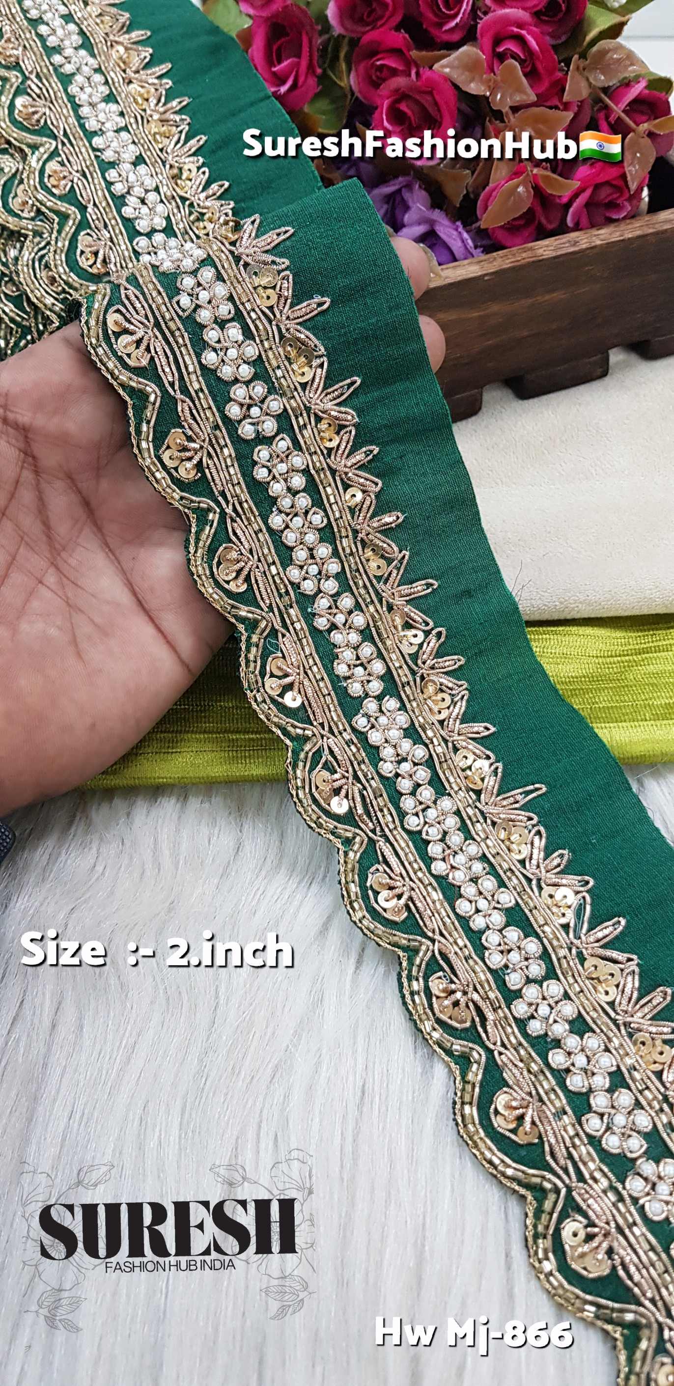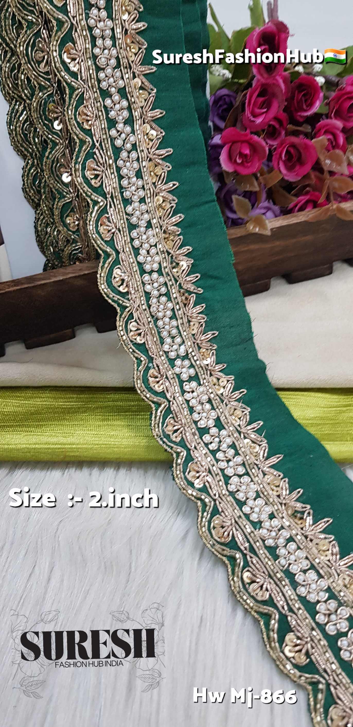*Mj-866* is a *pure handmade, one-side scalloped designer zardosi border, created by combining **three different handmade laces into one single fabric*. This unique fusion technique gives every piece a premium couture appearance.