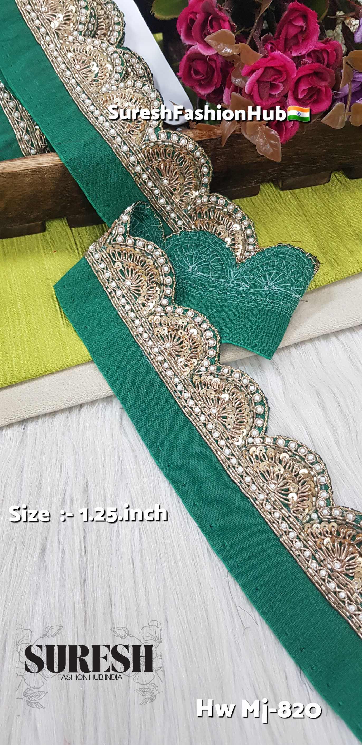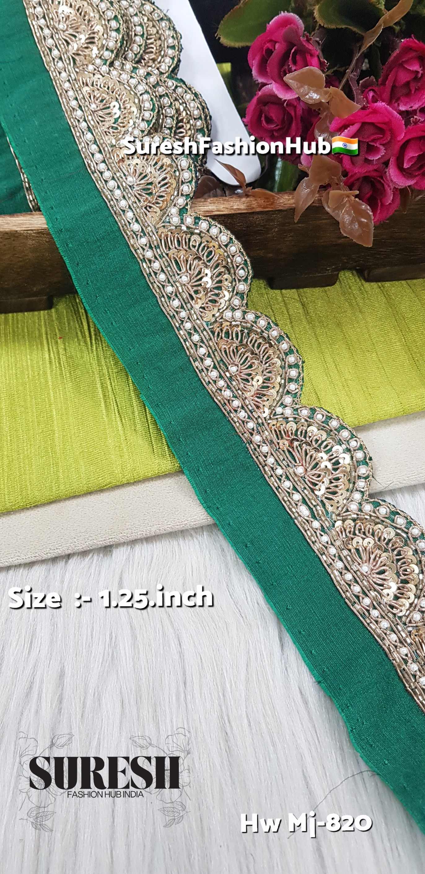 Introducing *Mj-820, a premium **pure handmade one-side scalloped zardosi lace* crafted on fine fabric. The border is beautifully detailed using *saadi, moti, sequence, zari, cutdhana and hand-placed beads*, creating a rich designer finish.