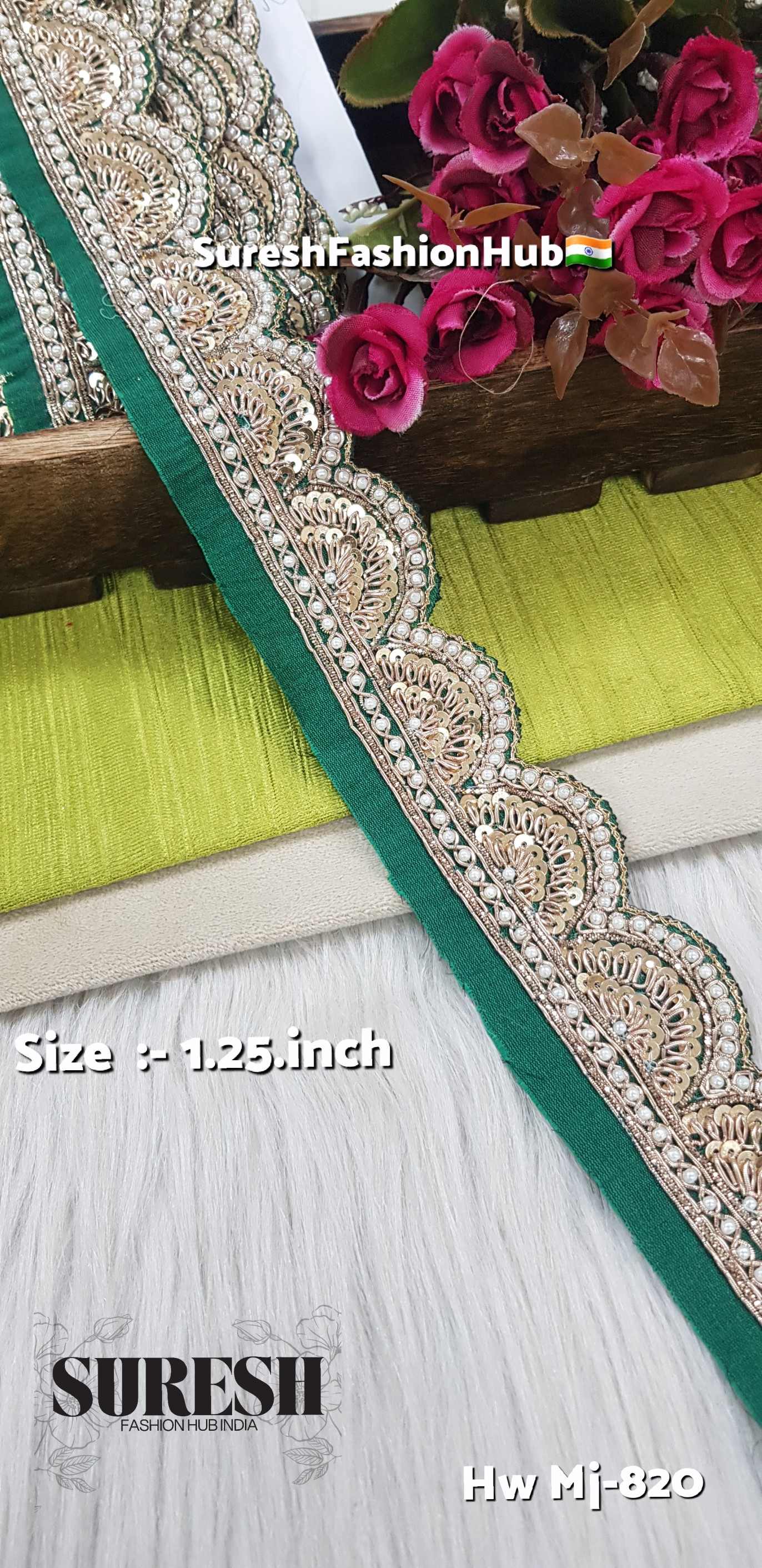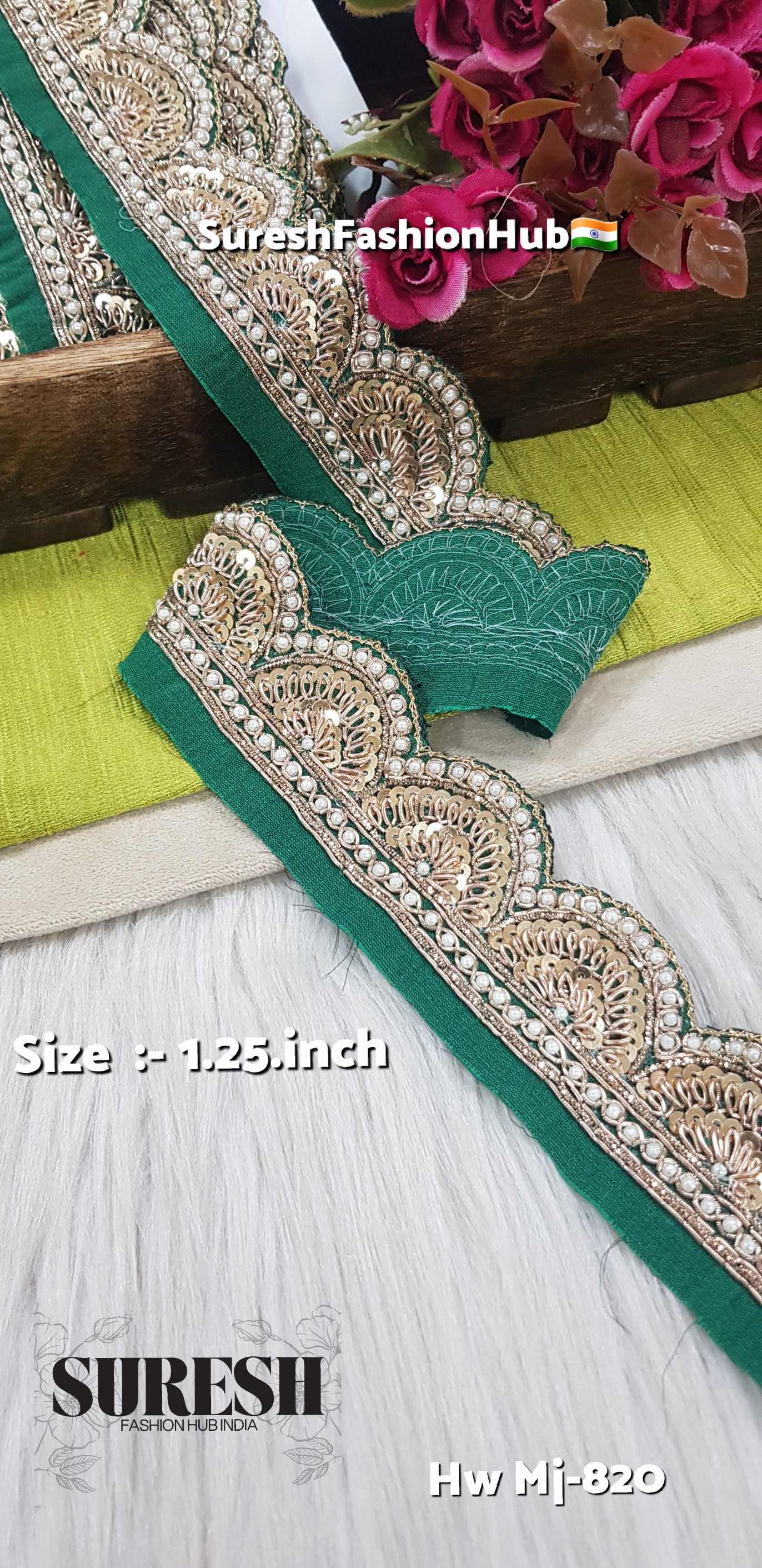 Introducing *Mj-820, a premium **pure handmade one-side scalloped zardosi border* crafted on fabric. This elegant lace is designed using *saadi, moti, sequence, zari, and nakshi*, giving it a rich and luxurious designer finish.