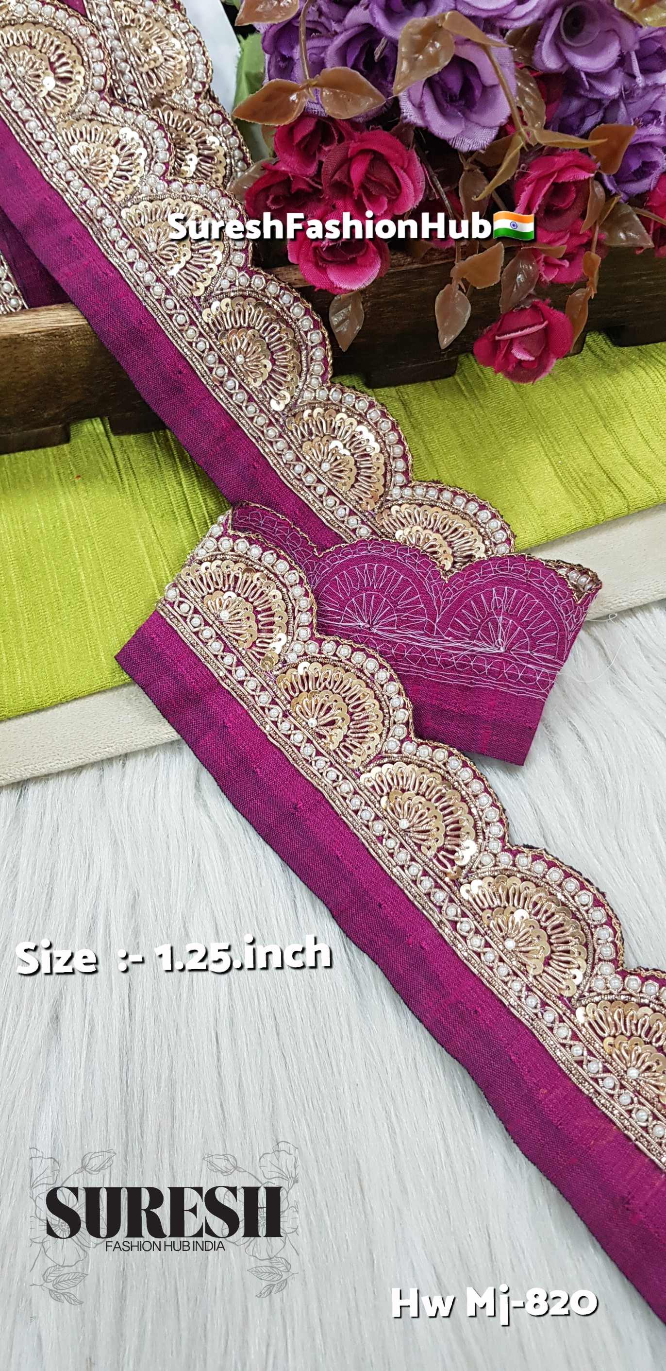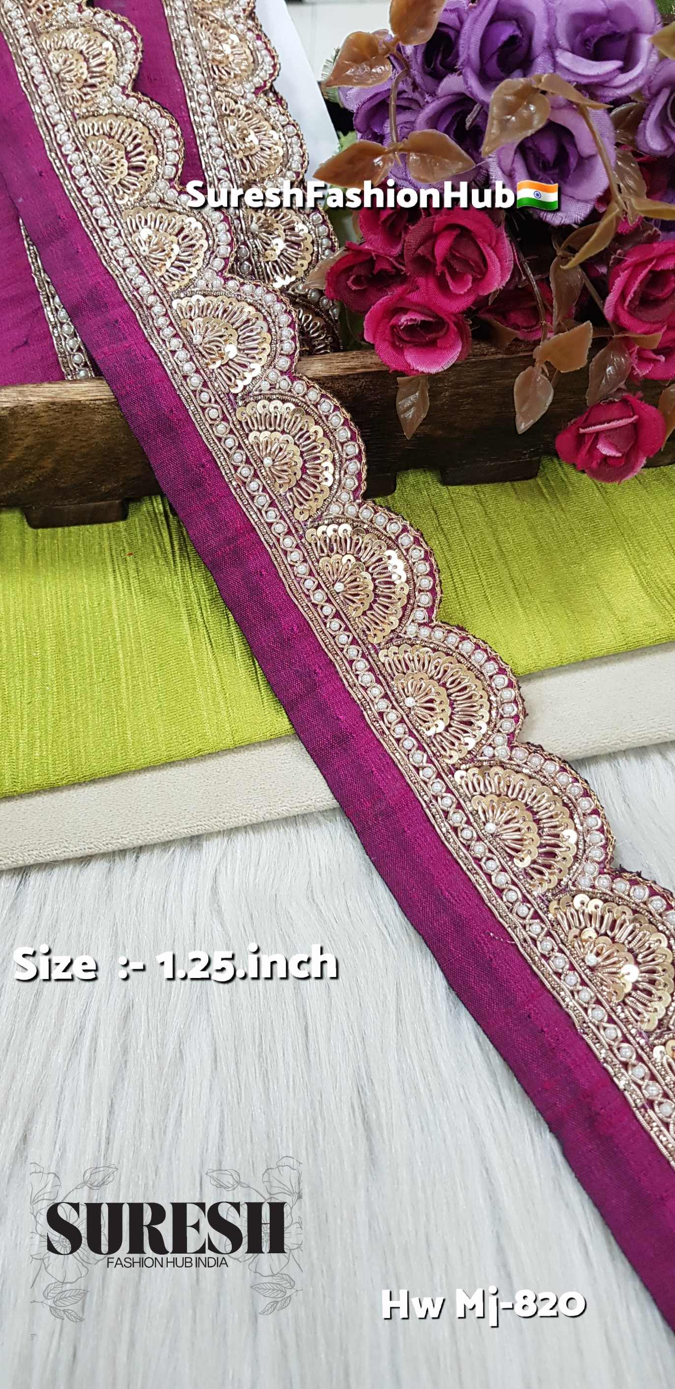 Introducing *Mj-820, a premium **pure handmade one-side scalloped zardosi border* crafted on fabric. This elegant lace is designed using *saadi, moti, sequence, zari, and nakshi*, giving it a rich and luxurious designer finish.