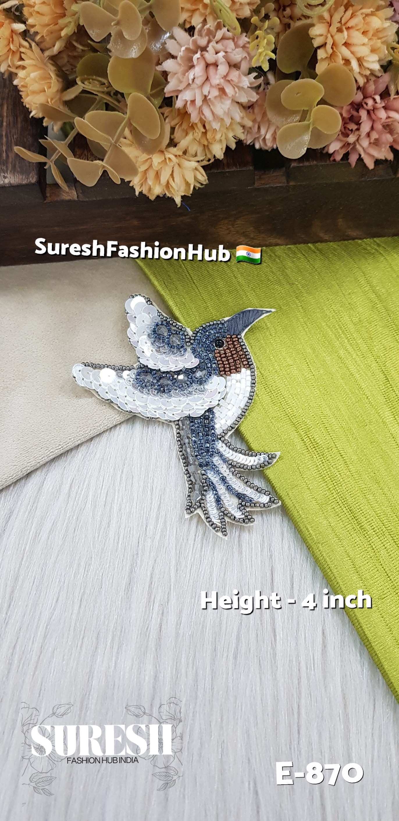 The *E-870 Flying Bird Patch* is a stunning handmade applique featuring a graceful bird motif in flight. Crafted with precision, it uses *threads, beads, cutdhana, crystals, and sequins, giving it a beautiful shimmer and lifelike detailing. This patch is versatile, making it perfect for both **western outfits* like shirts, skirts, jackets, and handbags, as well as *traditional wear* including sarees, blouses, lehengas, and dupattas.
