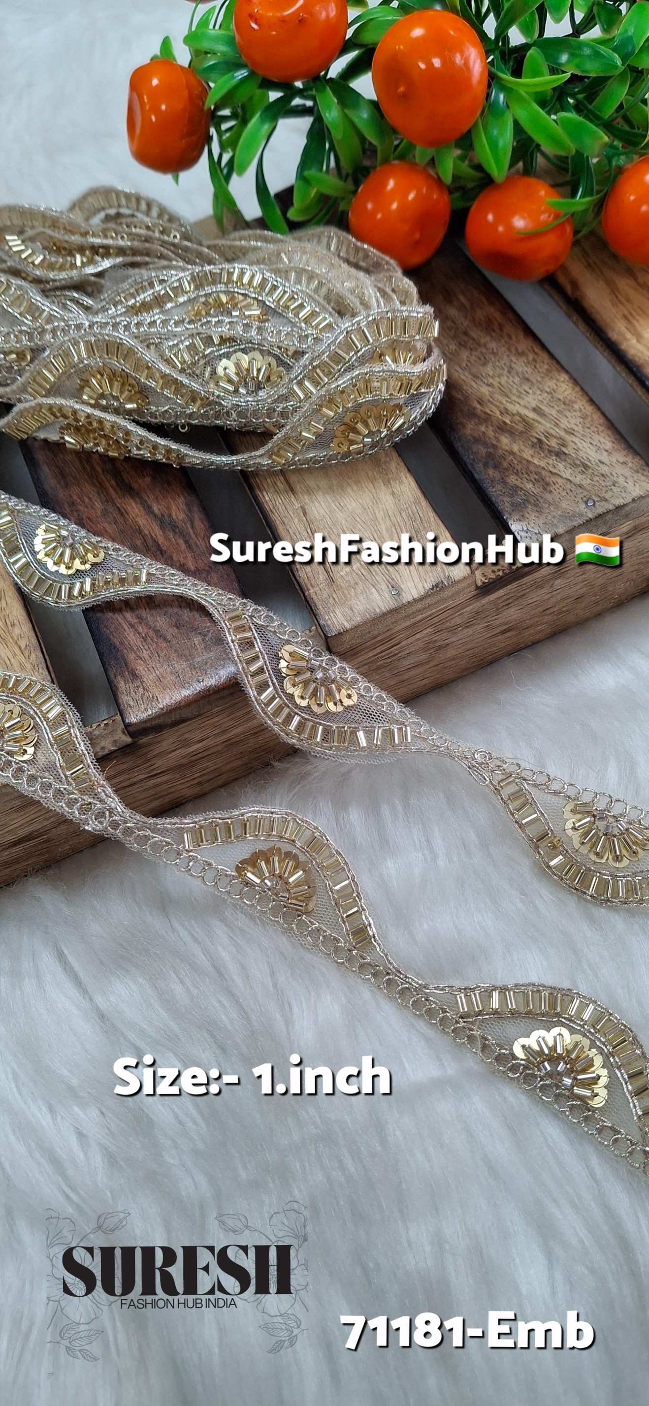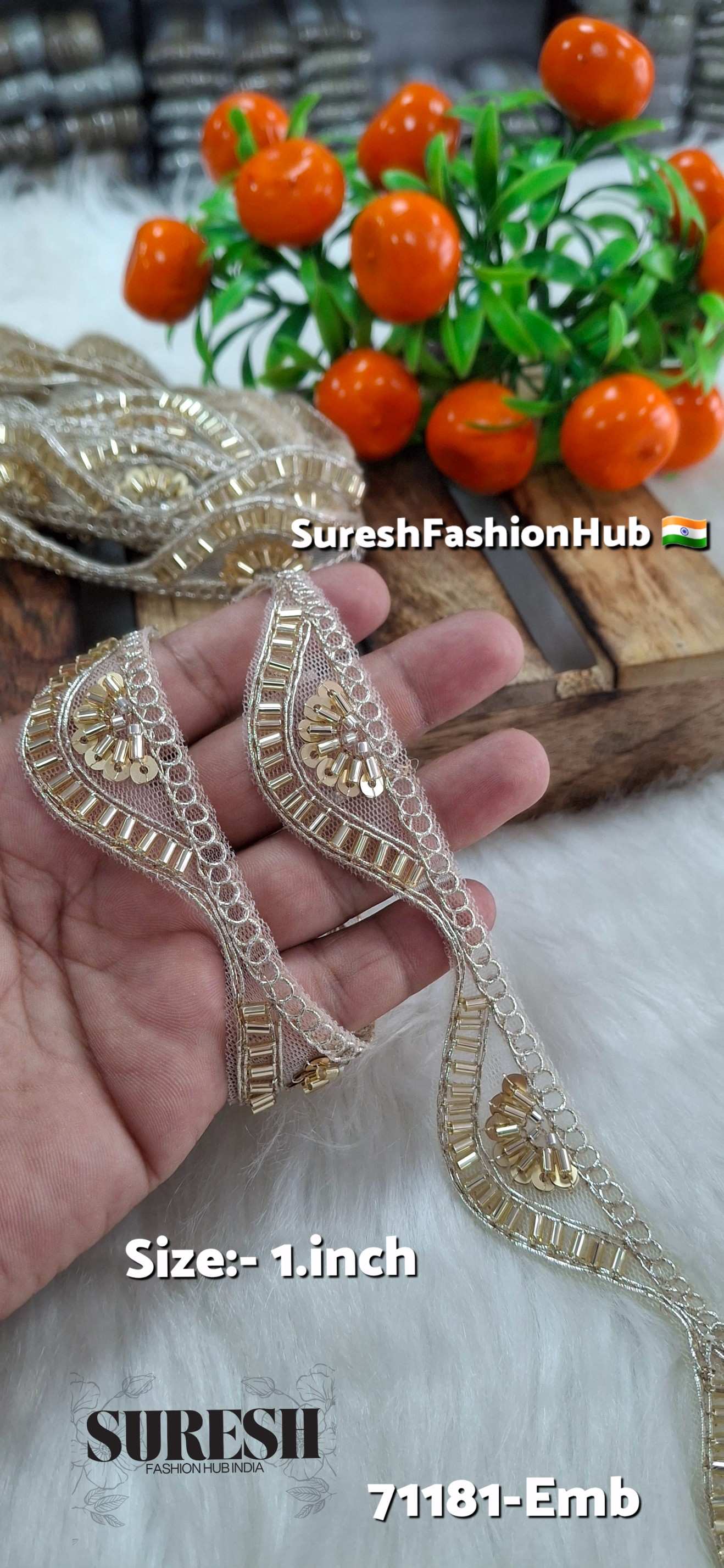 Design No. 71181-Emb* – A *1-inch premium embroidery lace* crafted on a soft light beige net base. This lace features a *machine-made, handmade-look embroidery* with a beautiful *one-side scallop floral pattern. It is elegantly adorned with **dori work, shimmering sequins, cutdana (bugle beads), and delicate round beads, giving it a rich and intricate appeal. The **pearl gold* tone complements both traditional and contemporary ensembles, adding a refined finishing touch.