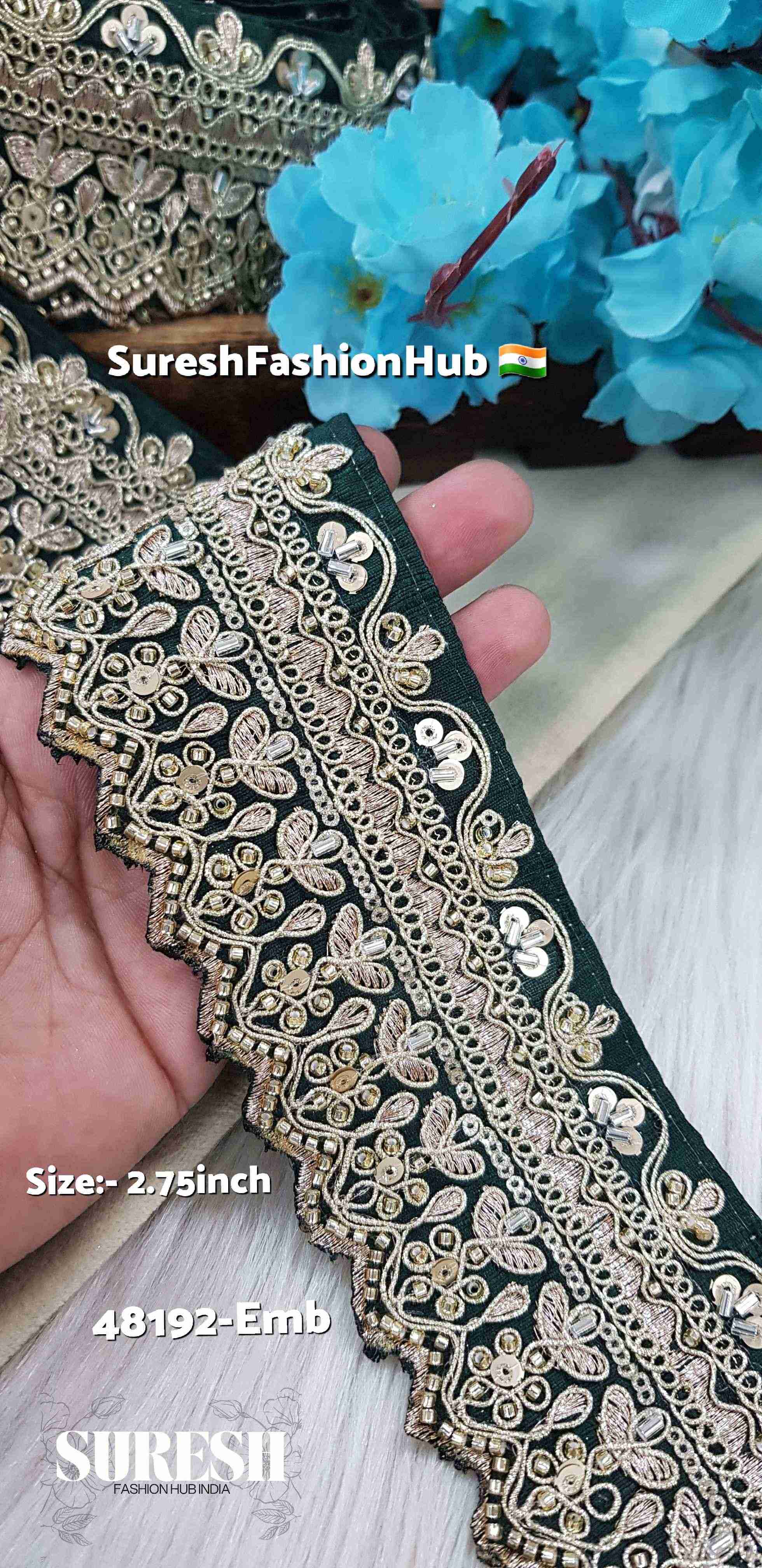 Elevate your designs with this *exquisite 2.75-inch one-sided floral embroidery lace, crafted with the perfect balance of **luxury and tradition. Designed on a **premium fabric base, this **machine-handmade lace* is intricately woven using *dori, zari, kaddhana, sequins, and beads, giving it a **rich, detailed look. With a **stunning one-sided design, it offers **versatility and elegance*, making it a must-have for designers and creators.