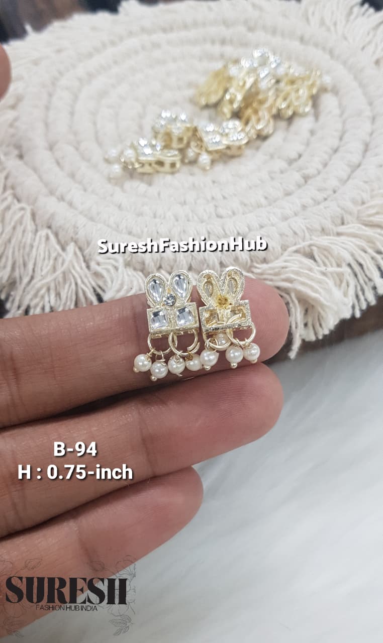 The surface is beautifully embellished with *kundan stones, square stones, and rhinestones, creating a sparkling and decorative finish. To enhance its aesthetic appeal, we have added **graceful hanging pearls (moti)*, giving the button a soft and elegant movement.