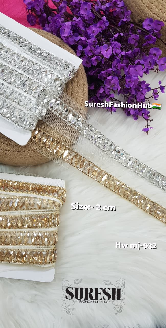 The design is made using a rich combination of *rhinestones and rhinestone chains, where the **chains are beautifully aligned on both sides*, creating a defined border effect. This dual-side detailing gives the lace a structured and finished appearance, making it highly elegant and unique.