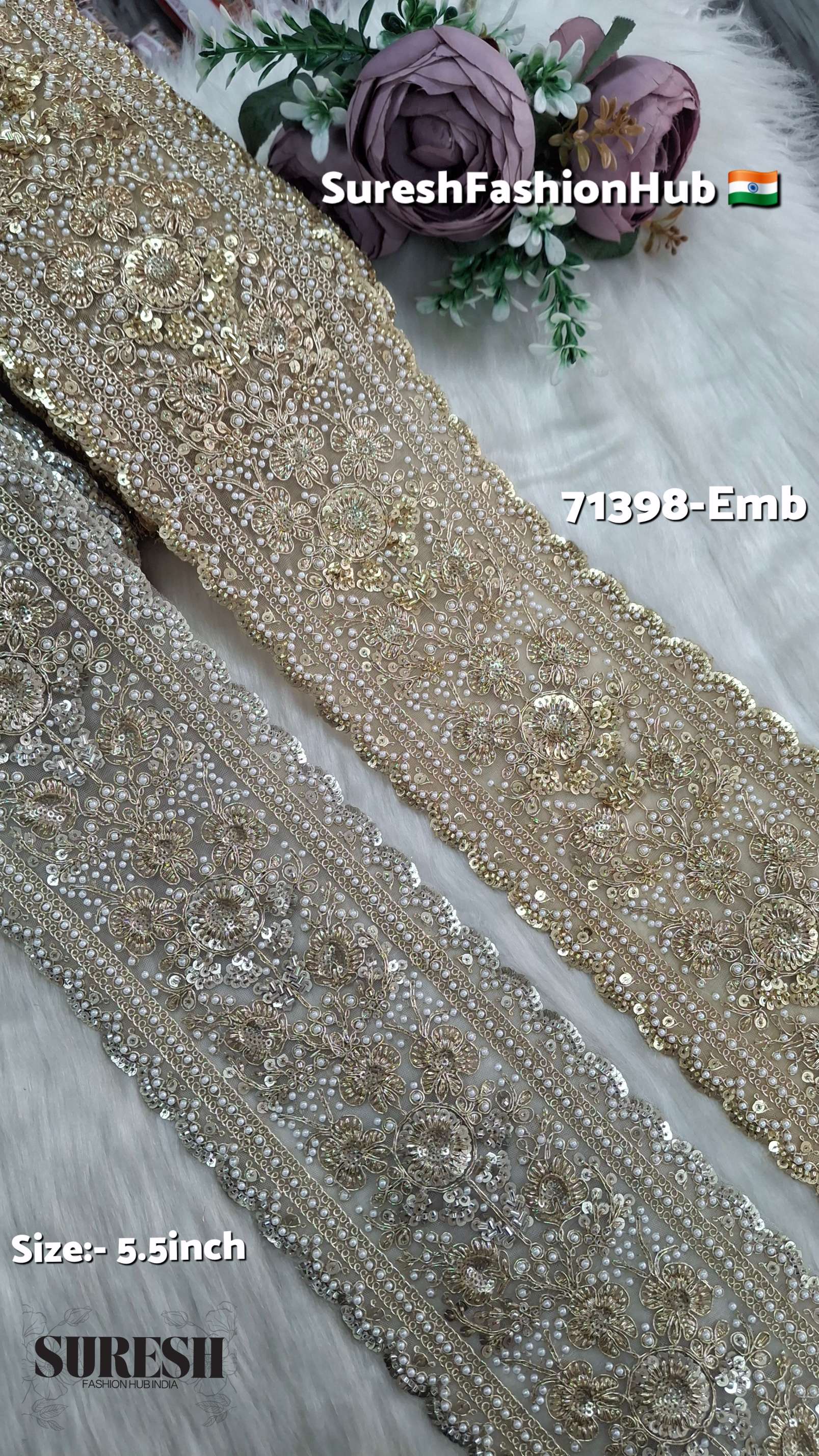 Sabyasachi inspired lace, floral embroidery lace, 71398-Emb lace, bridal embroidery border India, luxury floral lace, zari cutdhana lace, premium designer lace.