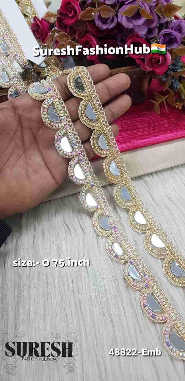 To elevate its visual appeal, the lace is *carefully cutworked and embellished with reflective mirror accents, allowing light to dance across the border and highlight the intricate beadwork. The flowing scalloped design creates a **soft hanging effect*, making it a perfect choice for statement edges and refined garment finishes.