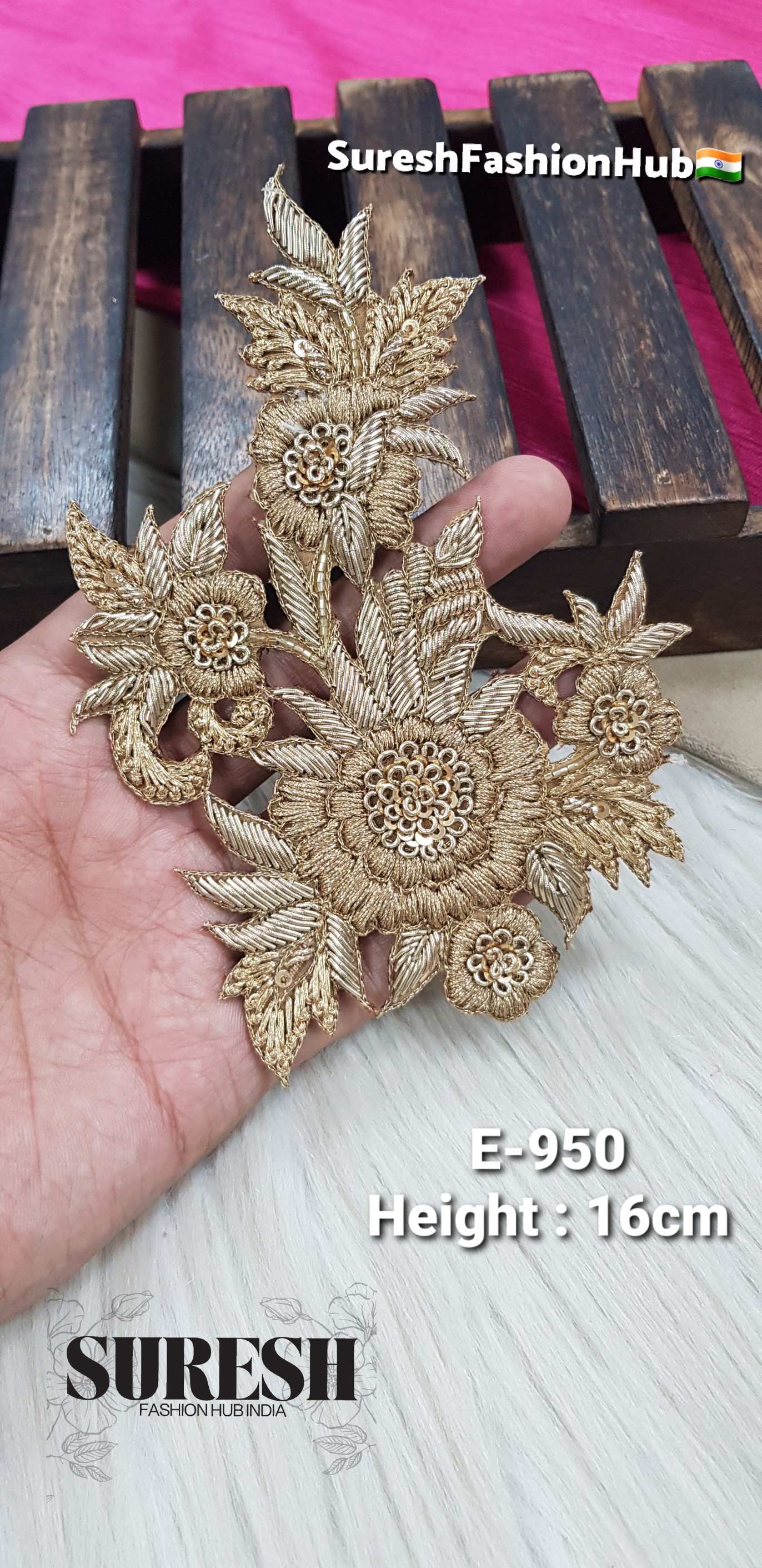 Introducing our *E-950 Handcrafted Floral Patch, a **unique and elegant floral design* created with a beautiful combination of *thread embroidery and rich zardosi craftsmanship*.