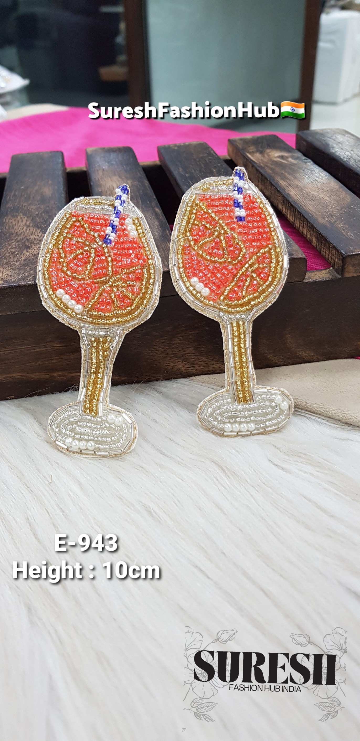 Orange juice patch, cocktail glass patch, handmade beaded drink patch, E-943 embroidery patch, novelty fashion patches India, beaded juice glass design, quirky handmade patches.