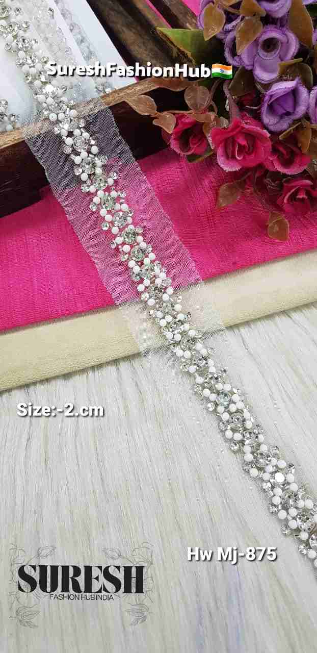 Handmade pearl rhinestone lace, net border lace, MJ-875 lace, bridal net lace India, pearl rhinestone embroidery border, luxury handmade lace, designer net lace.