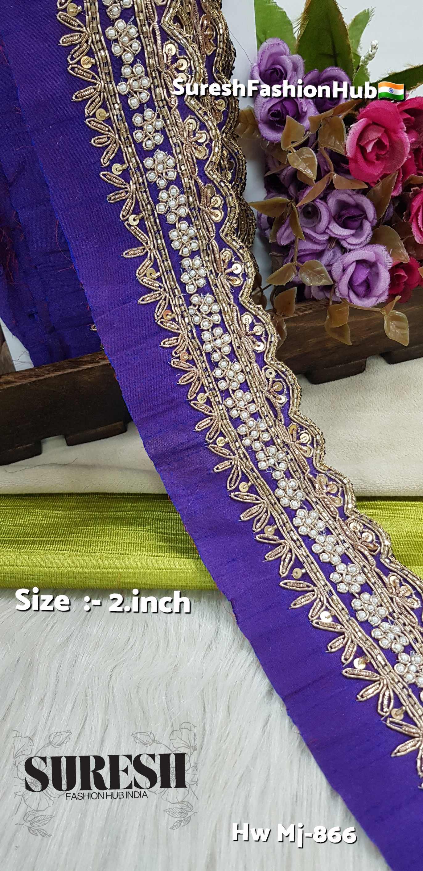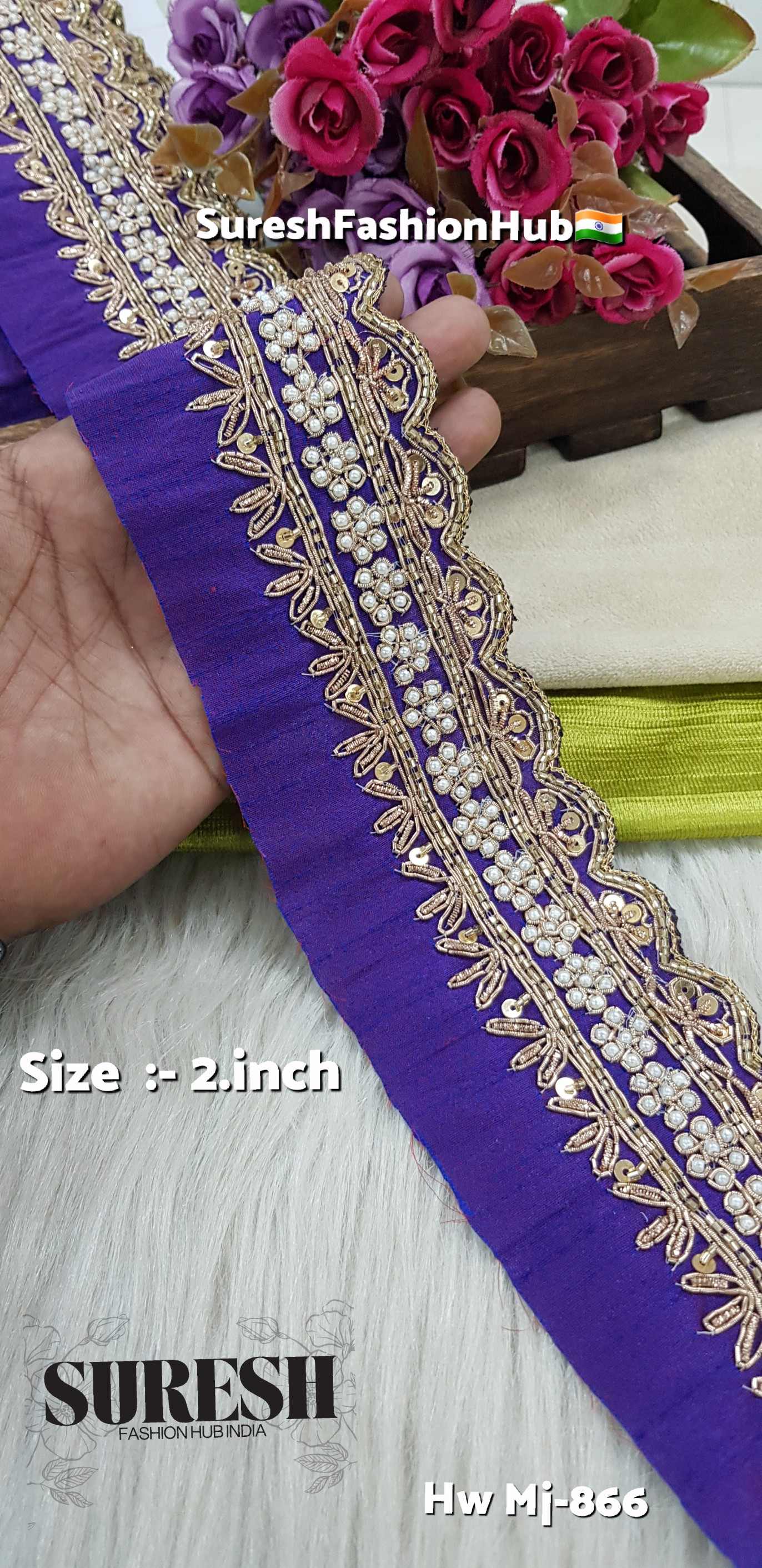 *Mj-866* is a *pure handmade, one-side scalloped designer zardosi border, created by combining **three different handmade laces into one single fabric*. This unique fusion technique gives every piece a premium couture appearance.