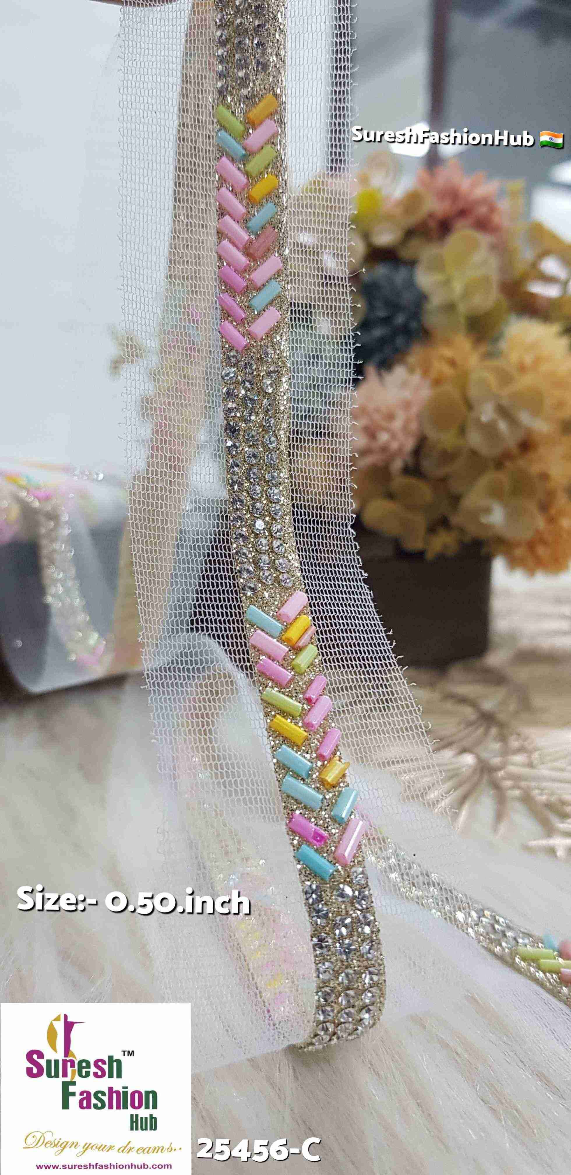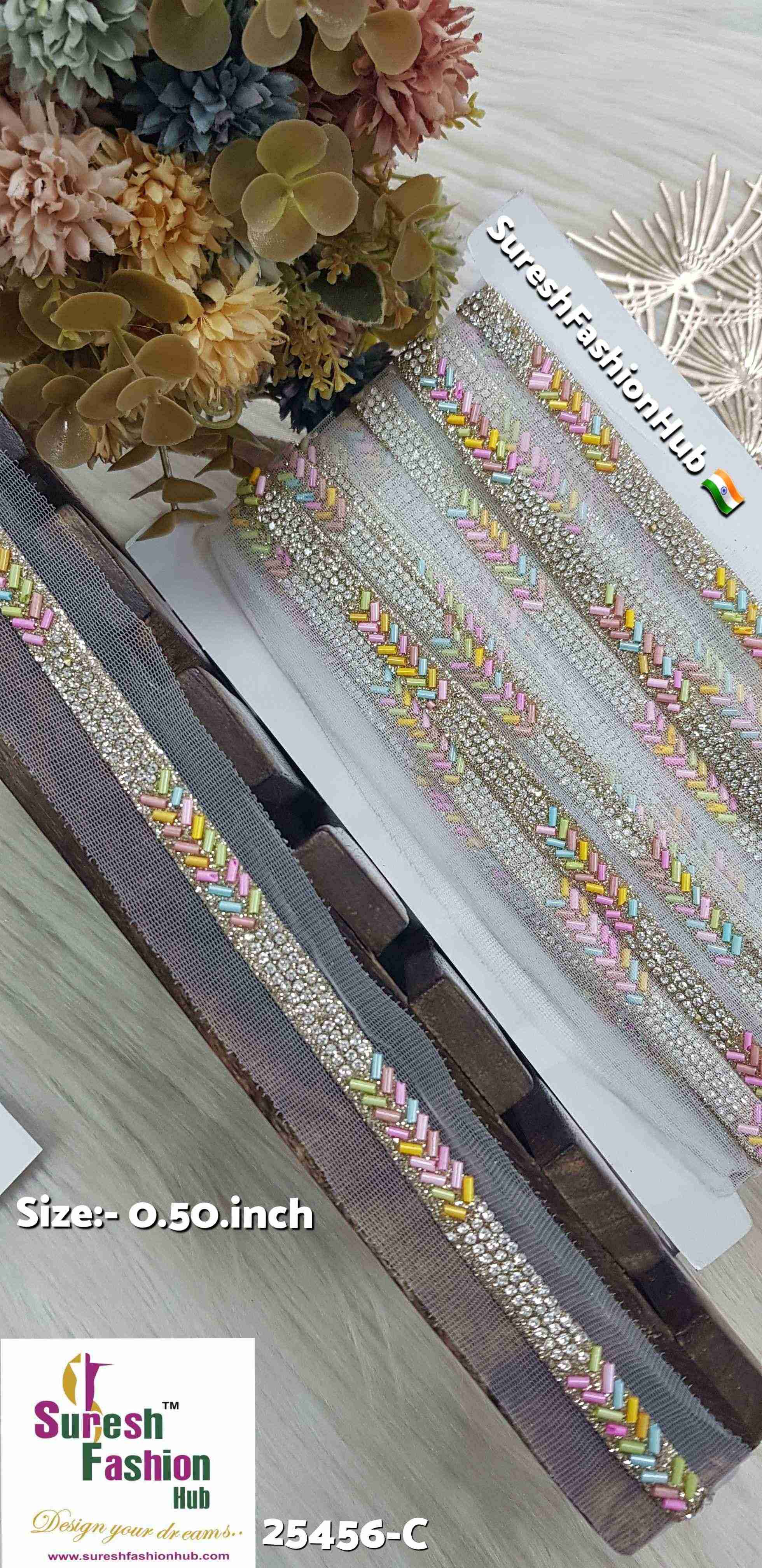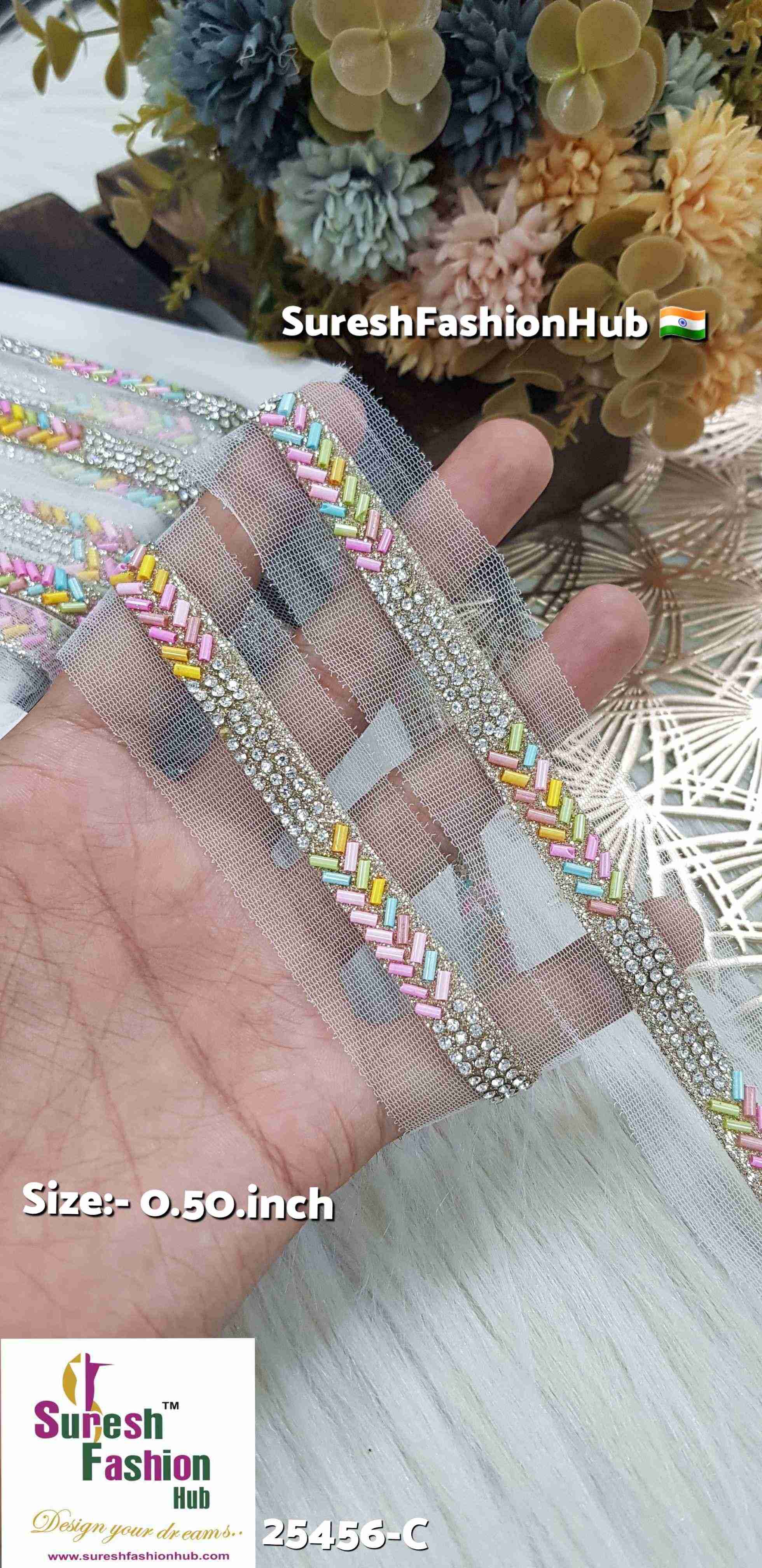 Indulge in the exquisite allure of our Jharkand Diamond Elegance Borders. Imbued with timeless sophistication, these borders seamlessly blend the intricate charm of kaddhana with the dazzling brilliance of diamonds. Adorned in a captivating multicolored pattern, each border exudes opulence and grace, adding a touch of regal splendor to any ensemble. Perfect for embellishing sarees, suits, lehengas, and more, these borders are a testament to refined luxury and impeccable craftsmanship. Elevate your creations with the unmatched beauty of our Jharkand Diamond Elegance Borders, priced at Rs 900 for 9 meters.