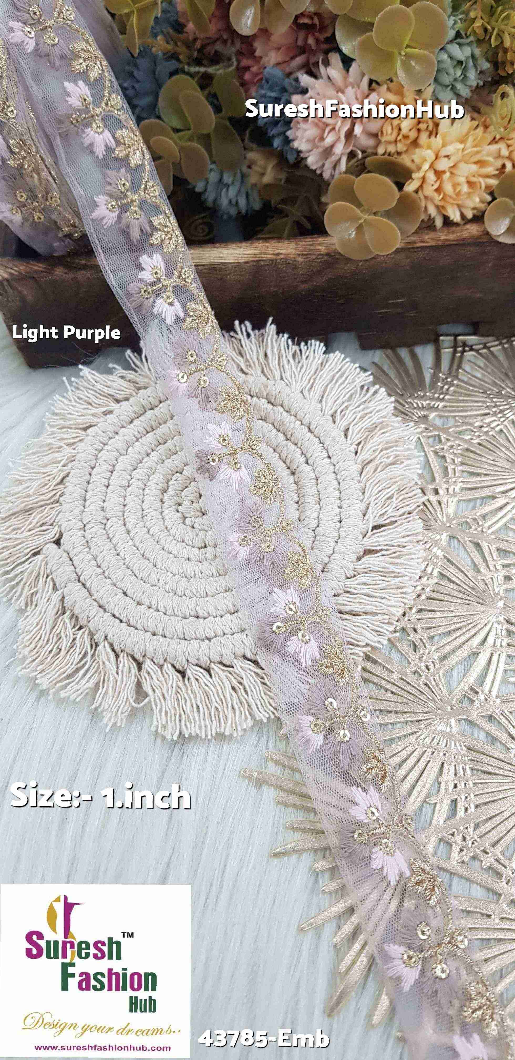 Elevate your creations with our exquisite Embroidery Lace collection - 43785-Emb. Each lace is delicately crafted on net fabric, adorned with intricate embroidery in an array of captivating colors. With its light and dark thread combinations, enhanced with shimmering zari and sequence detailing, these laces offer a touch of elegance and sophistication to any project. Choose from our seven enchanting color options to add a charming flourish to your designs.