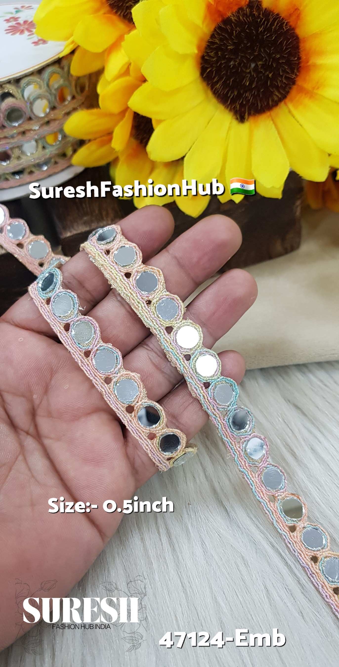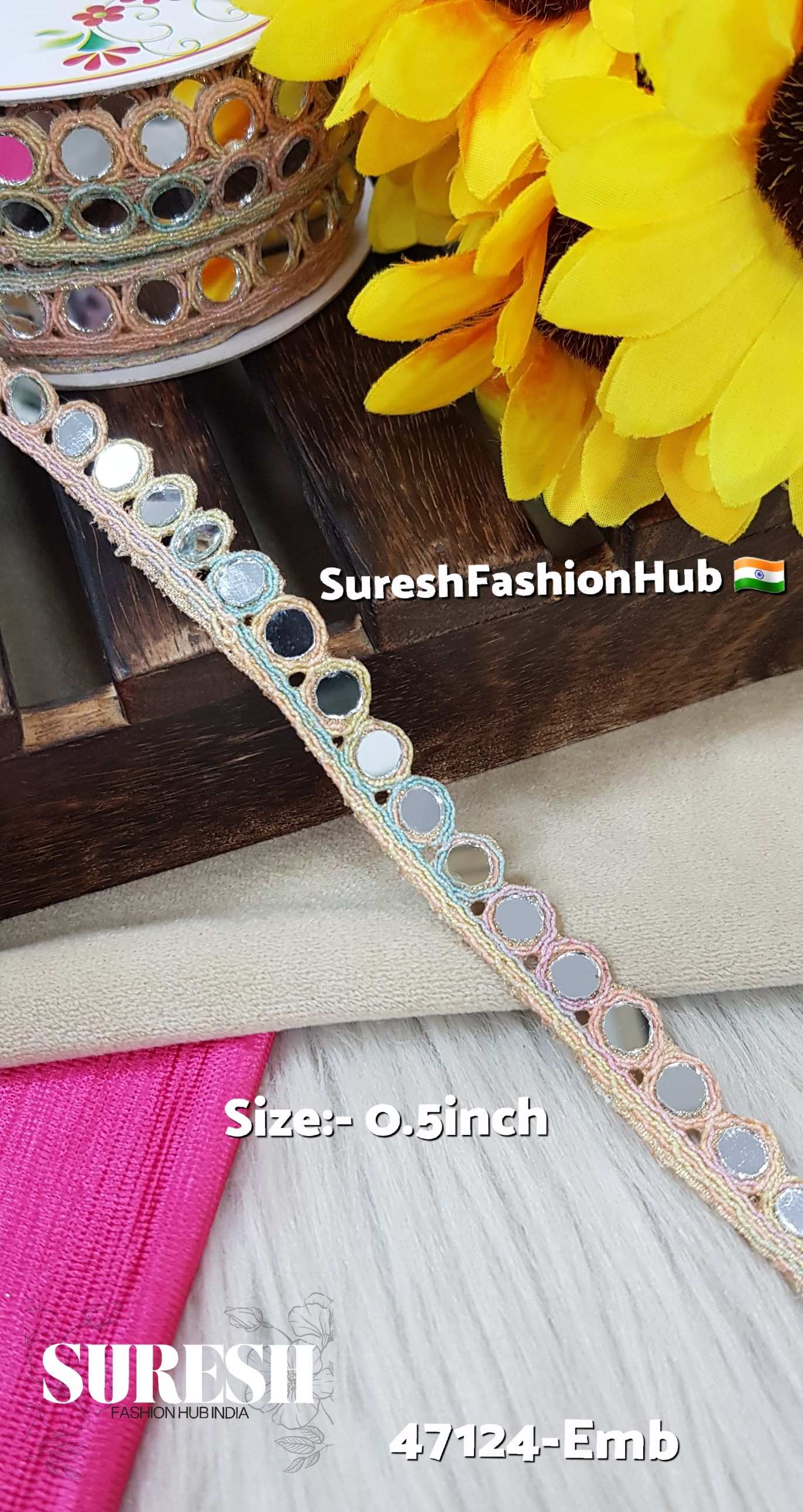 Introducing the *47124-Emb One-Side Round Mirror Lace, a stunning embellishment designed to enhance your creative projects. This **machine-made lace* features a unique *one-side cutwork design* adorned with perfectly placed *round mirrors*, creating a reflective and luxurious effect. Available in five exquisite shades, this lace adds elegance and charm to any outfit or decor item.