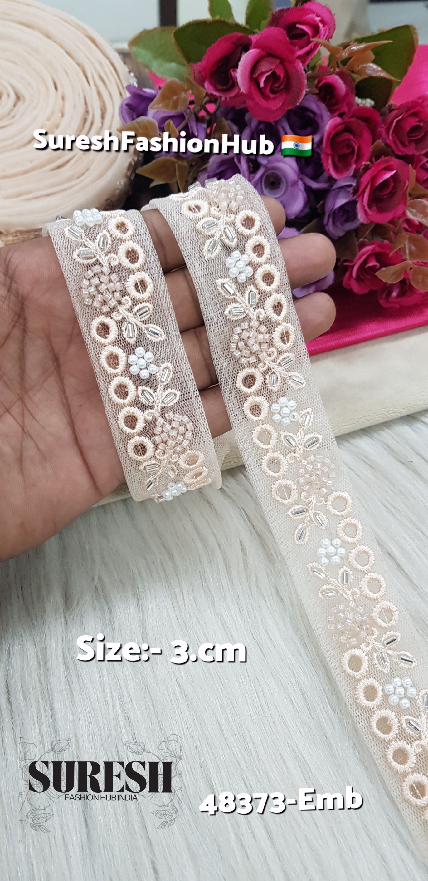 3cm embroidery lace, tone-to-tone net lace, machine hand embroidered lace, cutdana lace border, beads and pearl lace, designer lace wholesale India, 48373-EMB lace, net embroidery lace border, bridal lace trims India, SF India lace, Suresh Fashion Hub India lace, premium lace suppliers.
