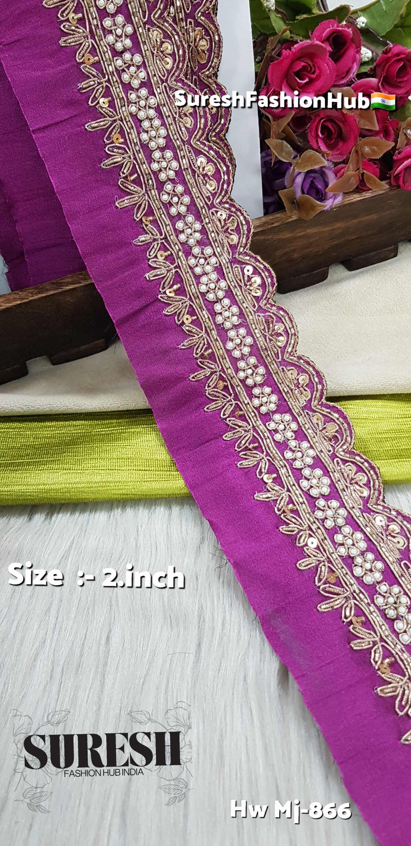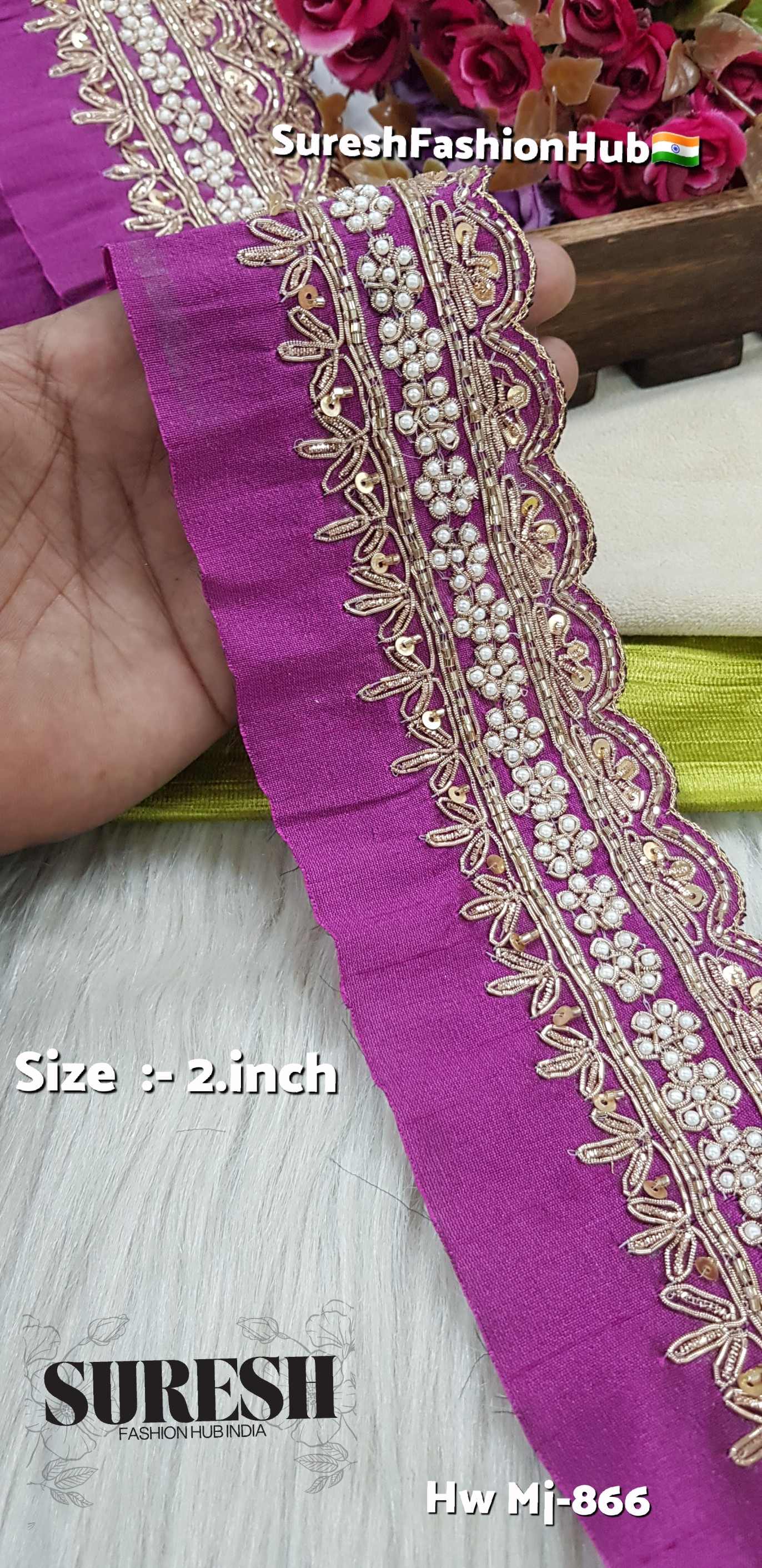 *Mj-866* is a *pure handmade, one-side scalloped designer zardosi border, created by combining **three different handmade laces into one single fabric*. This unique fusion technique gives every piece a premium couture appearance.