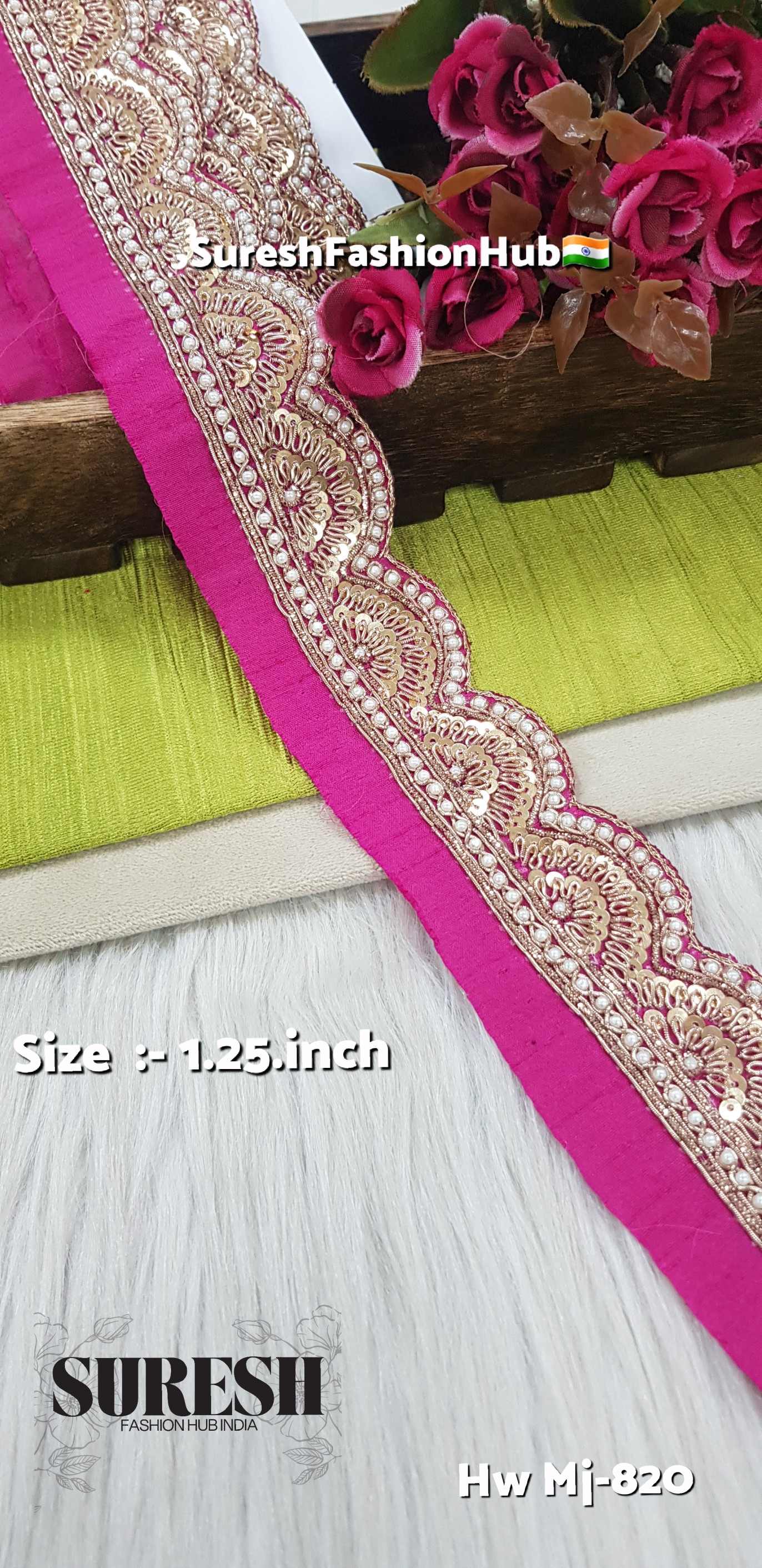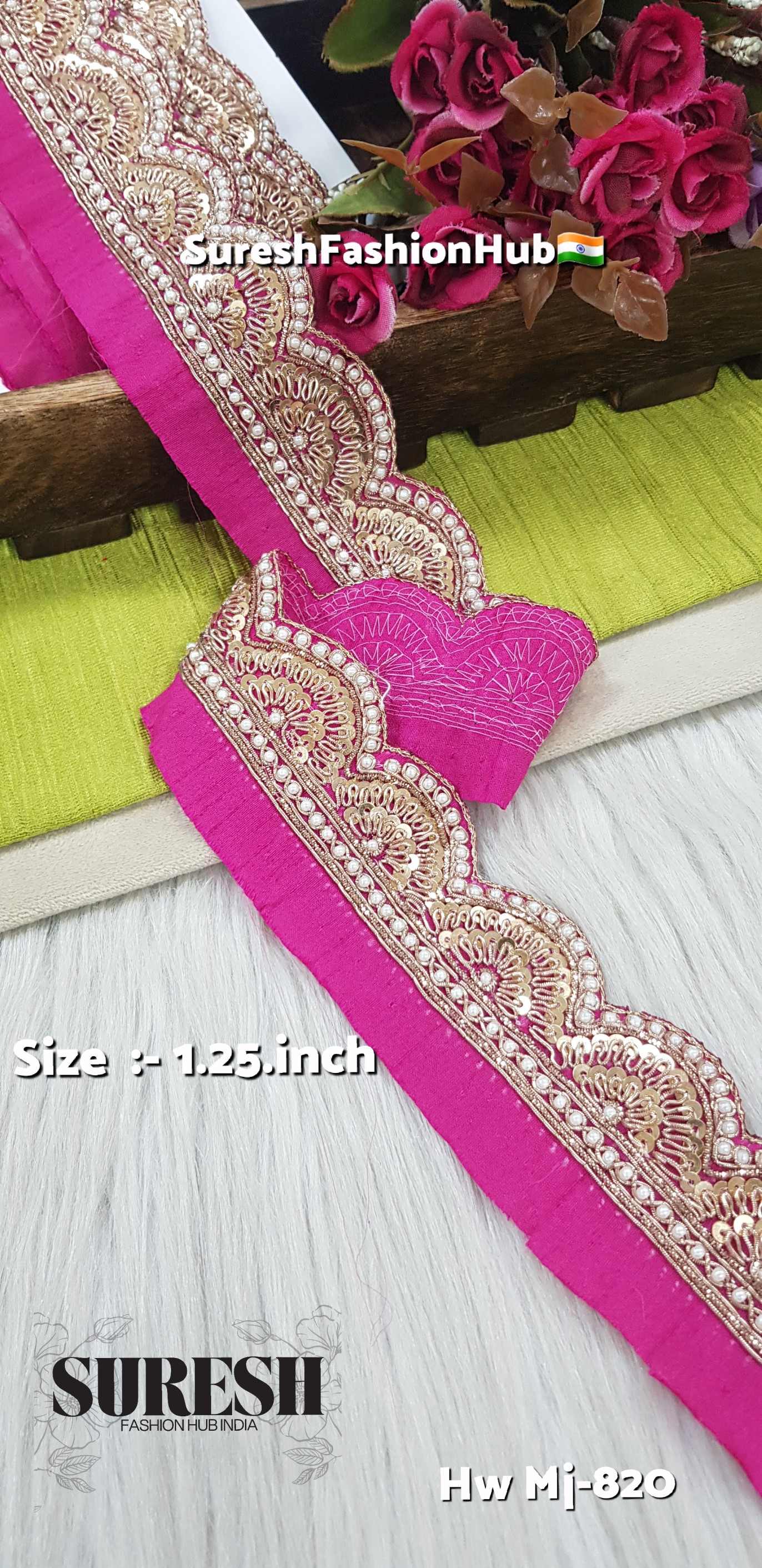Introducing *Mj-820, a premium **pure handmade one-side scalloped zardosi border* crafted on fabric. This elegant lace is designed using *saadi, moti, sequence, zari, and nakshi*, giving it a rich and luxurious designer finish.