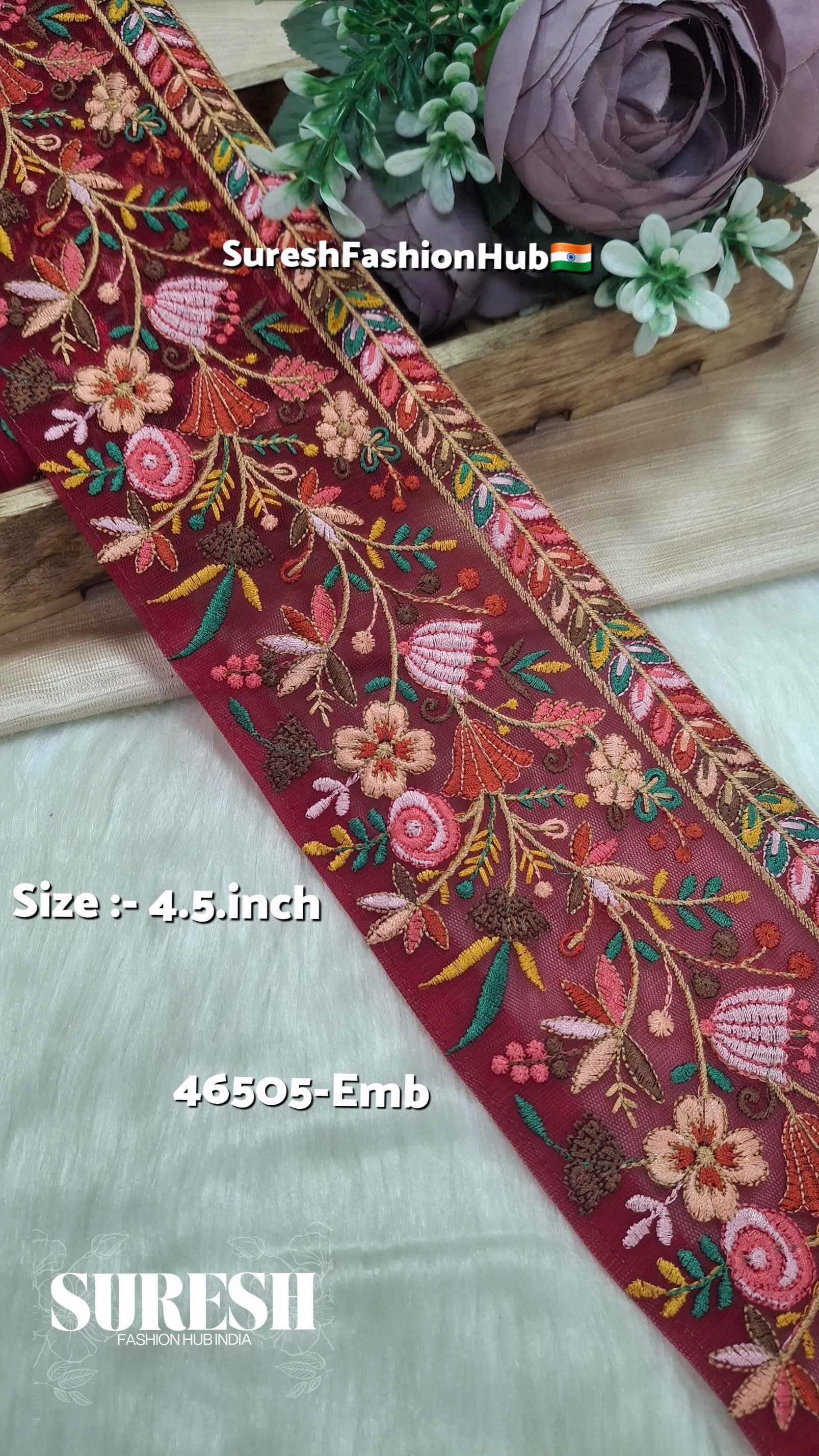 4.5 inch embroidery lace, net floral border, multi-color thread lace, designer embroidery lace India, nine-needle embroidery lace, premium net lace border, boutique embroidery borders, Suresh Fashion Hub India lace, floral net embroidery border, fashion garment lace trims.