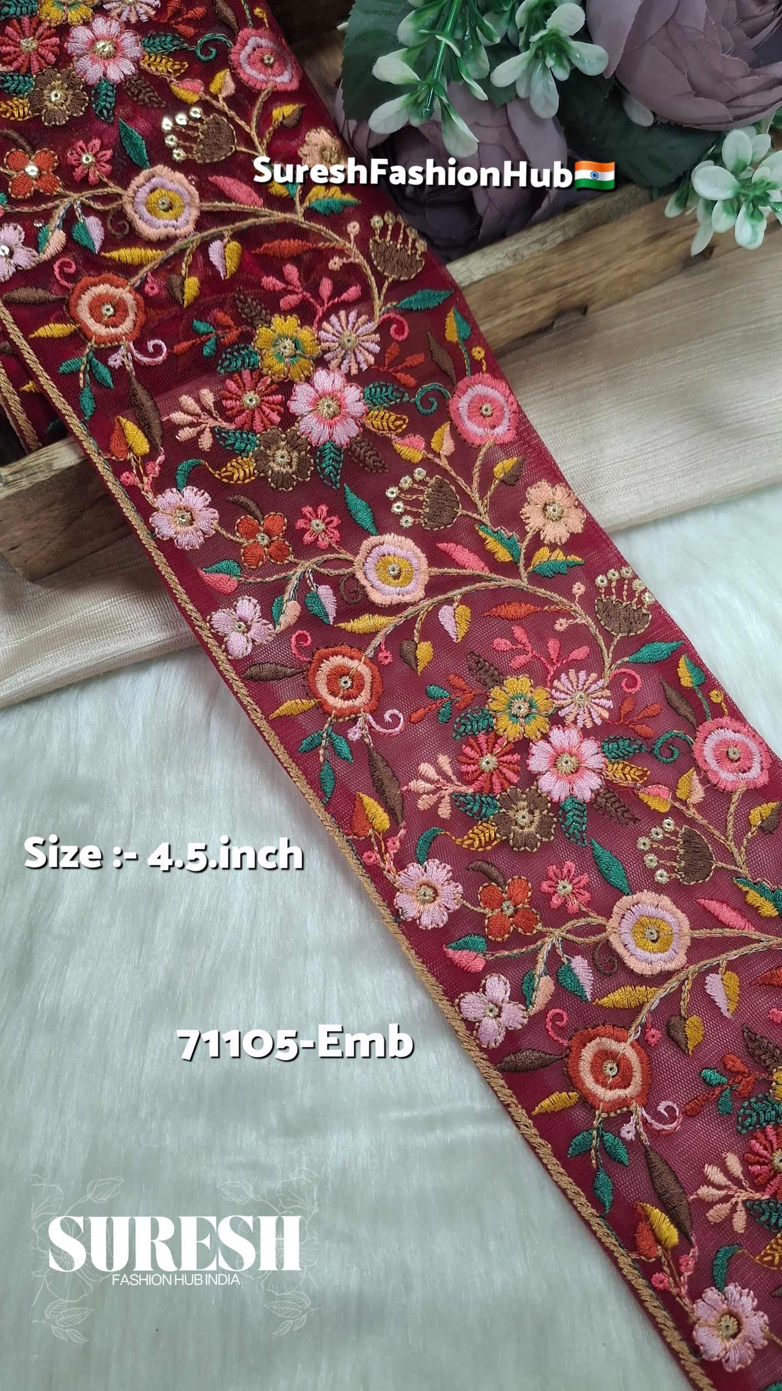 71105 embroidery border, multicolor floral thread lace, net embroidery lace 4.5 inch, machine hand embroidery border, designer net lace, floral net lace India, multicolor embroidery lace supplier, Suresh Fashion Hub trims, bridal embroidery lace border.